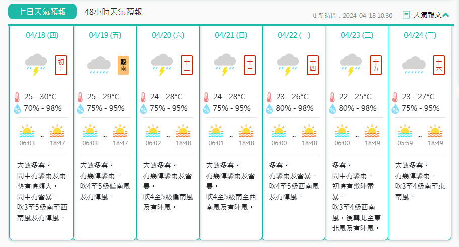 展望本週後期及下週初,本澳雷雨增多,間中雨勢較大。