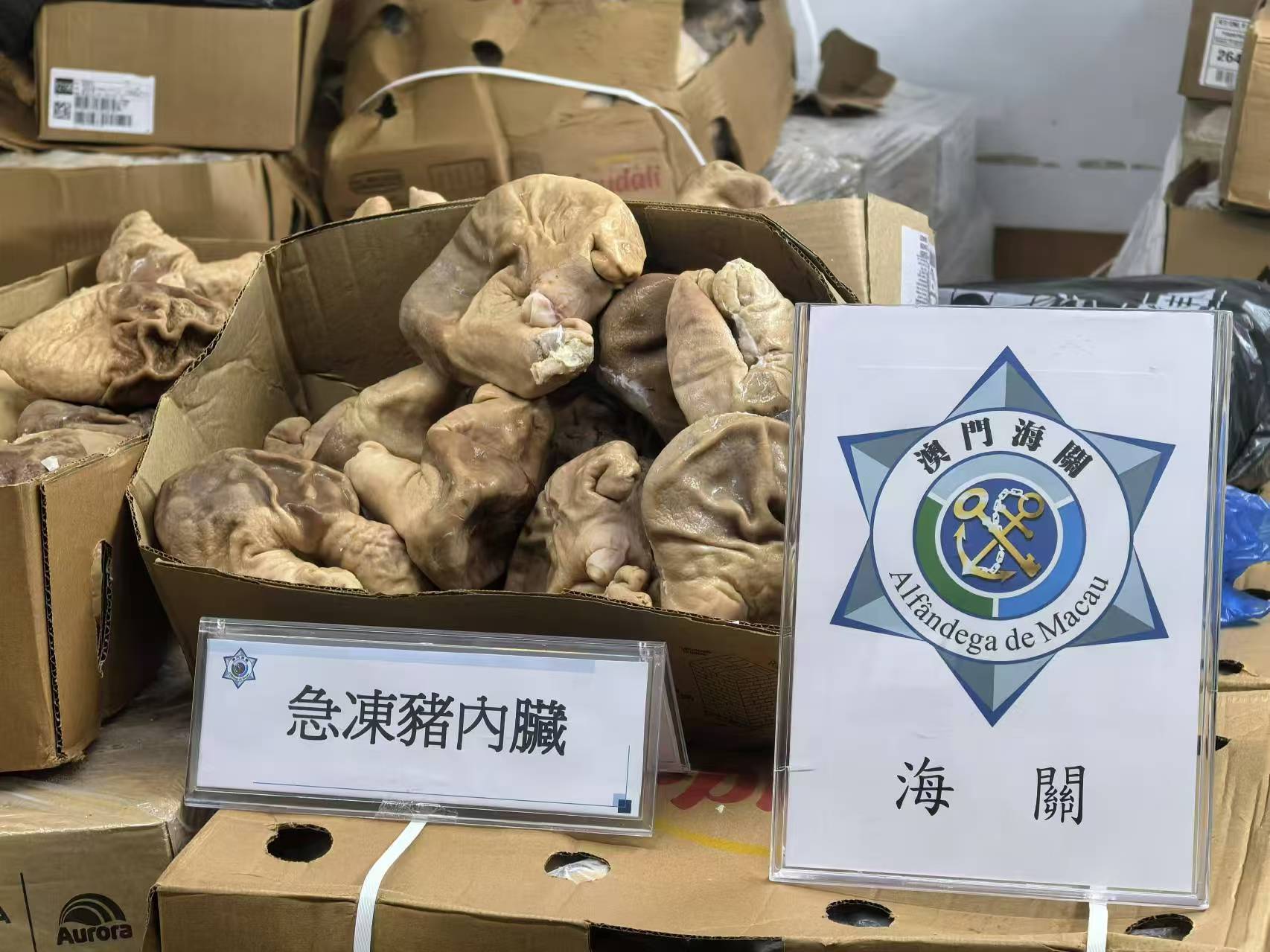 【即時新聞】海關持續開展針對水客散貨黑點巡查,今日下午四時許,海關根據接獲舉報,於關閘附近工廈搗破一個水客散貨點,起出一批重逾1660公斤豬內臟,市值約7萬澳門元,同時截獲一名男負責人。