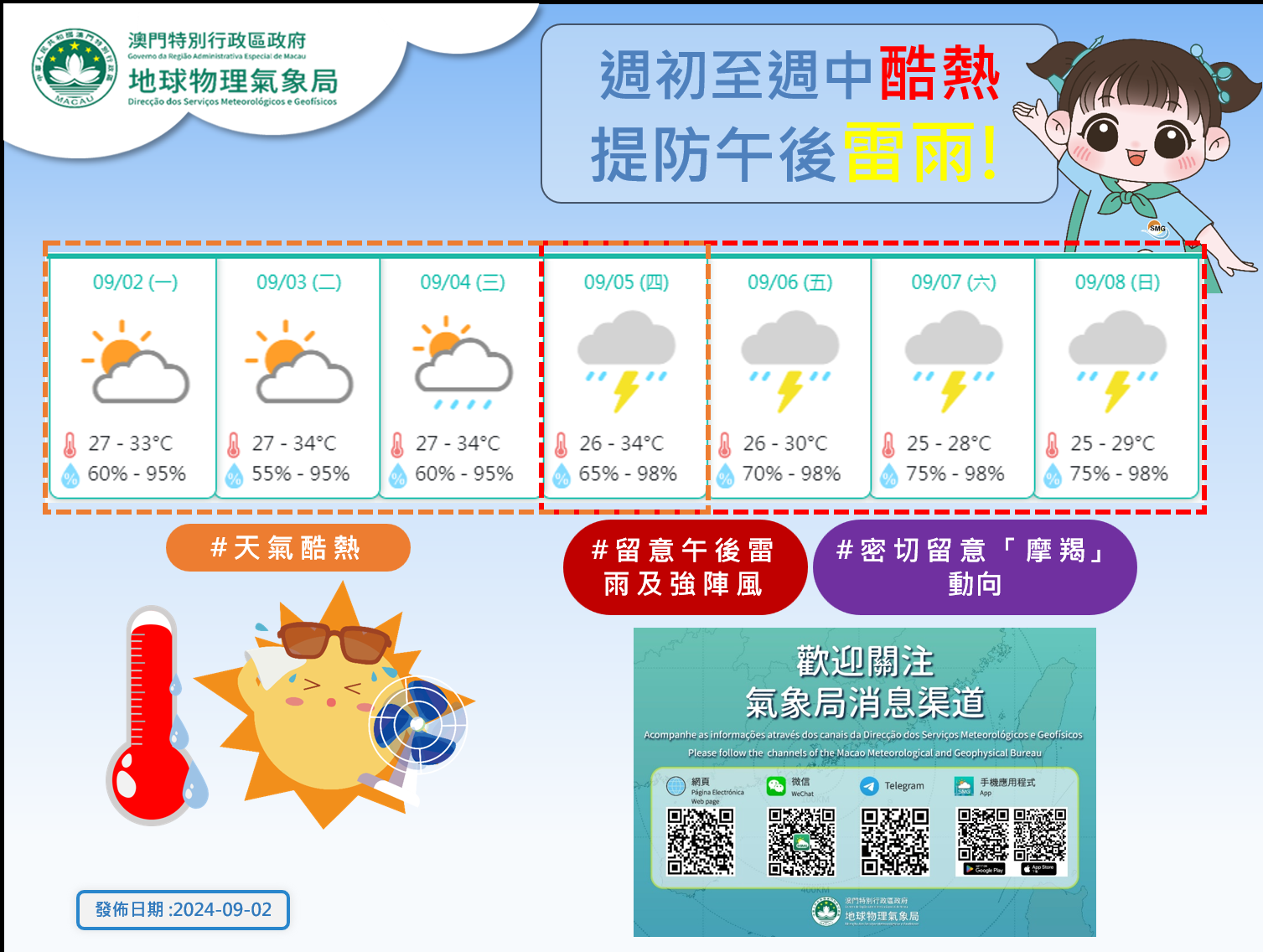 持續受高空反氣旋影響,本澳週初日間天氣酷熱,同時,隨著熱帶氣旋「摩羯」於週中進入南海,受其外圍下沉氣流影響,氣溫將進一步上升,日間非常酷熱。高溫天氣下,午後有機會觸發雷雨並伴隨強烈陣風。