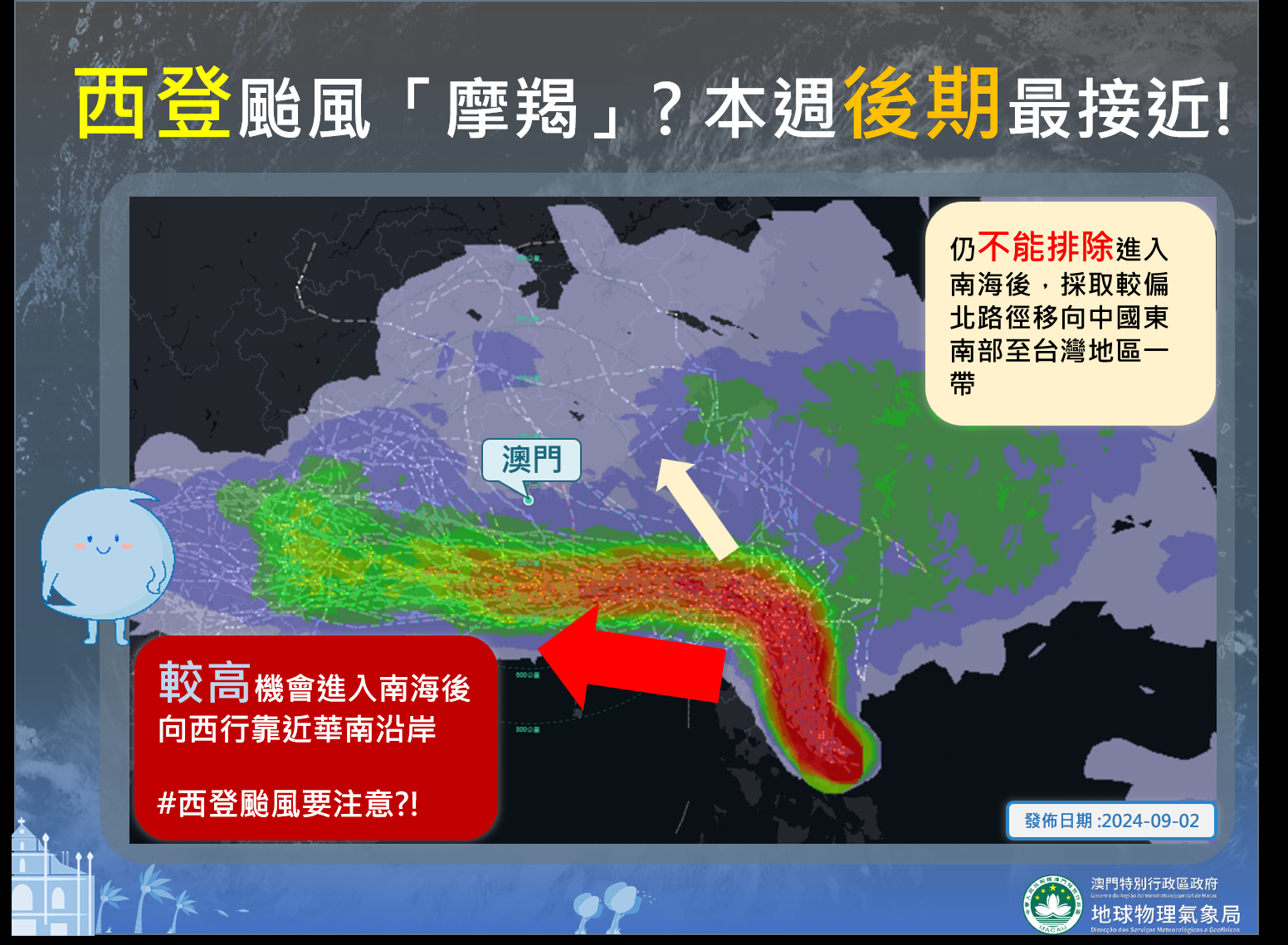 氣象局預料,按照目前的預測資料顯示,「摩羯」進入南海後,較高機會採取偏西路徑移動,並橫過南海北部,強度亦將逐漸增強,有機會達到強颱風級別;因此,暫不排除本週後期於本澳以南300公里範圍內掠過,但目前不確定性仍較大,需視乎「摩羯」進入南海後的強度、路徑和環流大小等發展情況而定。