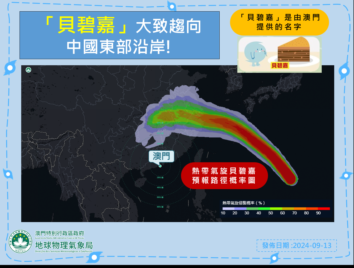 現時位於西北太平洋上的熱帶氣旋「貝碧嘉」,結構仍較鬆散,按最新的預測資料顯示,貝碧嘉將向西北方向移動,強度逐漸增強,由於預料其下周初大致趨向中國東部沿岸,因此對本澳造成直接影響的機會仍較小。