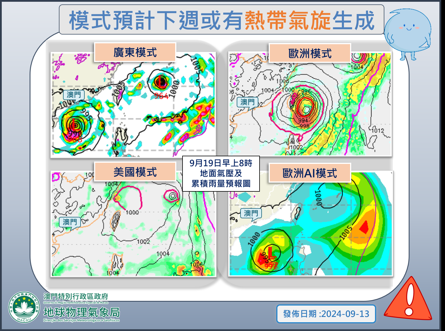 從現時的數值模式預報資料顯示,西北太平洋仍然具備條件持續發展並生成熱帶氣旋,但各模式對於其實際生成的位置及動向,仍然存在較大的分歧;初步預計,下周中後期較大機會有一至兩個熱帶氣旋於西北太平洋至南海一帶生成,氣象局將持續監察其發展,請市民持續關注氣象局的最新天氣資訊。
