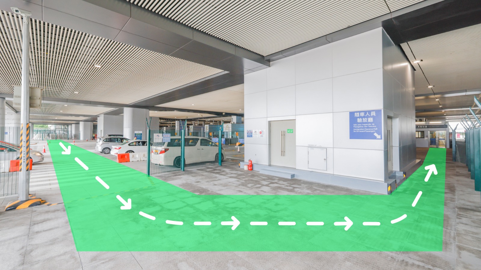 1. 乘客在落客區下車,沿人行橫道前往出境隨車人員驗放廳。(圖二)