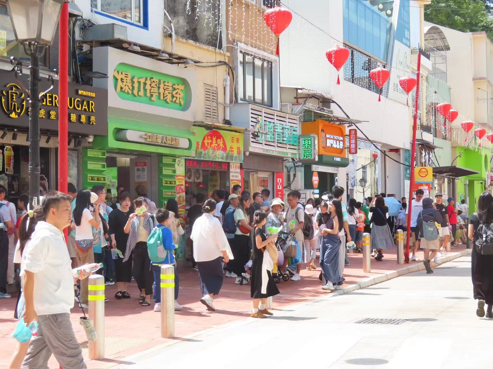【即時新聞】國慶假期間,特區政府於每日中午12時至晚上7時,在氹仔舊城區設置臨時行人專用區。今午記者走訪官也街一帶,在黃金周帶動下區內人流眾多,部分小食店外出現排隊人龍,有雪糕店店員表示,假期人流不似預期,對比去年同期下跌逾三成,行人區的實施更分散客流,影響生意,形容“差過暑假”。受訪商戶認同行人區提供了更安全和舒適的步行環境,提升旅遊體驗,並減少區內交通擁堵的情況。但他認為受大環境的影響,中小企經營困難,今年假期客流量及銷售額較去年同期下跌近四成。
