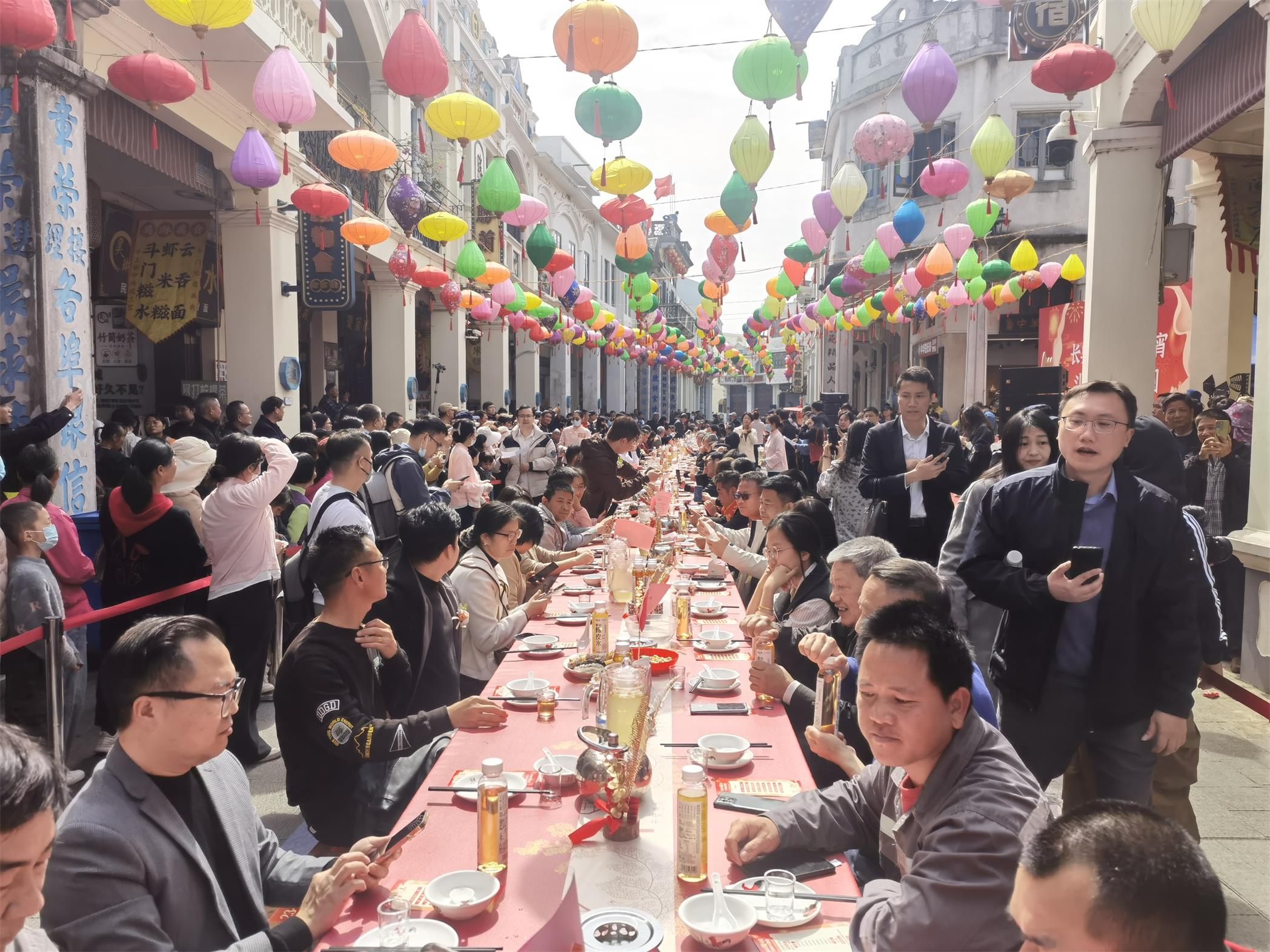 當天中午,古韻悠悠的中國歷史文化名街——斗門舊街張燈結綵,熱鬧非凡,一場別開生面的百人長桌宴盛情啟幕。活動邀請了一直以來關注、支持和參與“大斗門”建設的超百位社會各界人士和港澳台僑胞等嘉賓共用盛宴,共慶團圓。