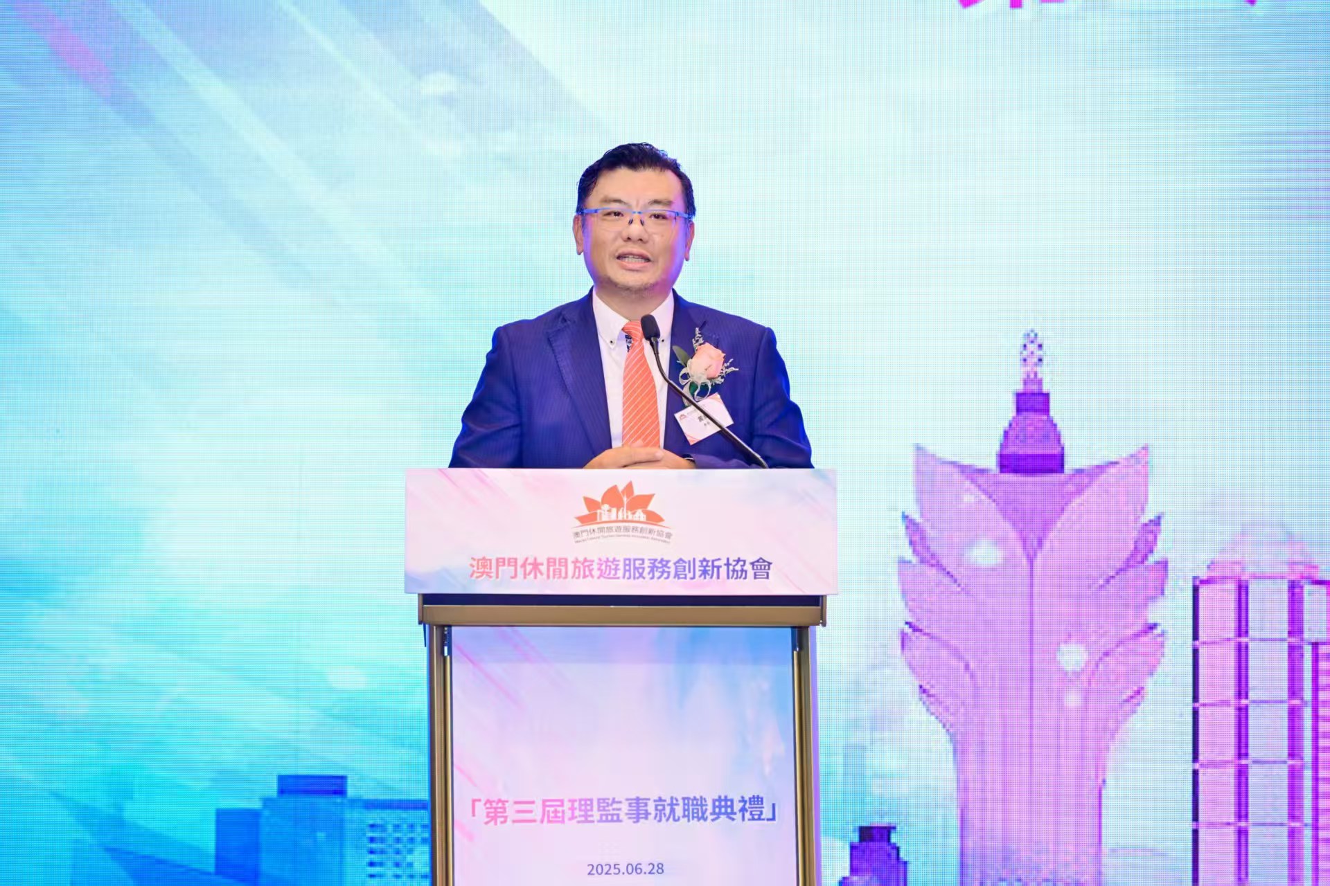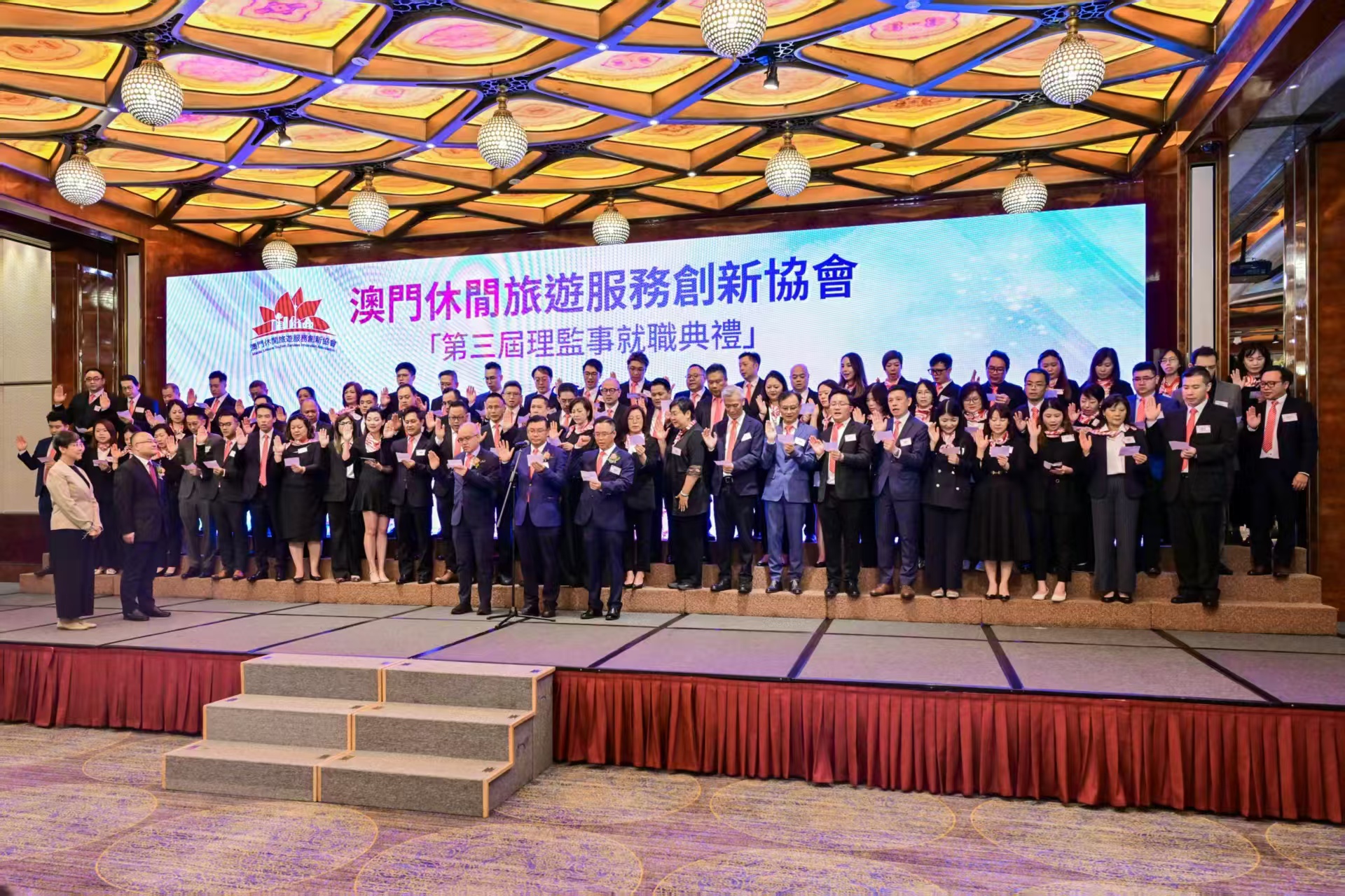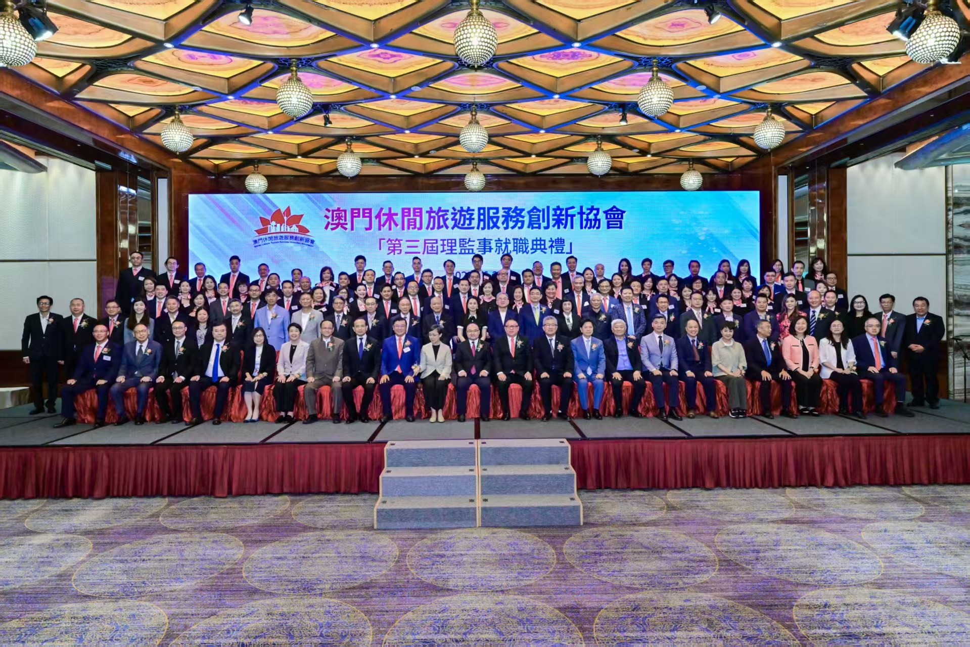 就職典禮於晚上7時舉行。中聯辦經濟部部長劉德成,旅遊局局長文綺華,世界旅遊聯盟代表、綜合事務部專案官員肖震,澳區全國政協常委、澳門旅行社協會會長、該會榮譽會長劉雅煌,澳區全國政協委員、行政會委員、立法會議員葉兆佳,澳區全國政協委員、澳門法制研究會會長、該會法律顧問陳華強大律師,行政會委員、立法會議員、該會榮譽會長陳澤武,文化局局長梁惠敏,體育局長張子軒,經濟及科技發展局副局長鄭曉敏,民航局副局長馮偉龍,招商投資促進局會展發展及活動推廣廳高級經理陳啓銘,立法會議員、澳娛綜合度假股份有限公司董事、該會榮譽會長梁安琪,立法會議員、澳門旅遊商會理事長、該會榮譽會長張健中,澳門國際機場專營股份有限公司執行委員會主席陳穎雄,橫琴粵澳深度合作區經濟發展局文旅會展商貿處處長林衍傑,永利澳門有限公司總裁、董事會副主席兼執行董事、該會榮譽會長陳志玲,銀河娛樂集團董事、該會榮譽會長程裕昇,中國旅行社協會副會長、廣州廣之旅國際旅行社股份有限公司董事長、總裁鄔琛,該會創會會長胡景光,世界旅遊聯盟會員關係部夏霜,浙江大學旅遊研究所副所長周永廣等業界嘉賓出席。澳門休閒旅遊服務創新協會會長黃輝、理事長陸連金,及行政會委員兼該會監事長唐繼宗迎迓。