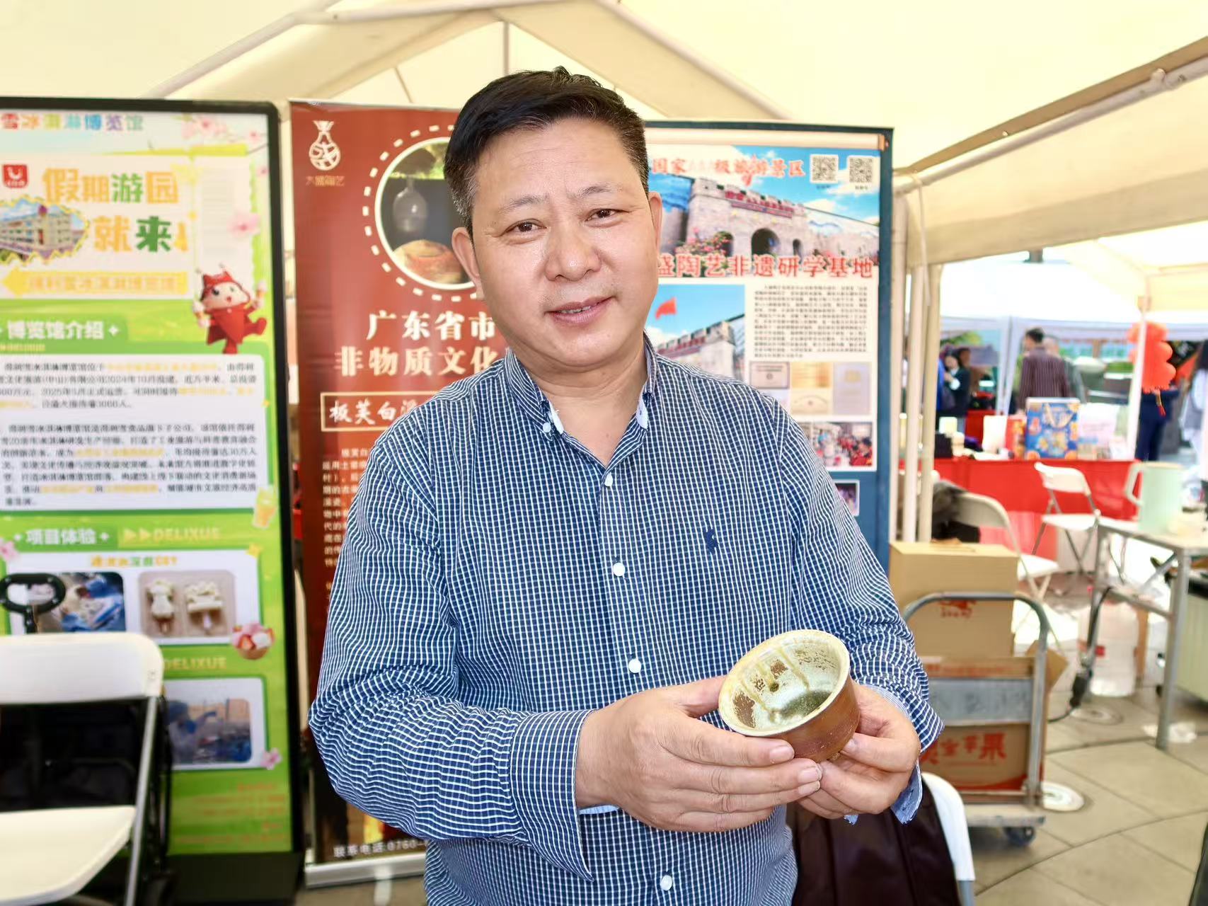中山市級非遺項目「板芙白溪瓷釉彩燒製技藝」代表傳承人崔先生此次參展,重點推介當地的陶藝非遺研學基地,提供陶藝手工泥塑、拉坯、彩繪,以及沙畫、扎染等非遺體驗課程,每年接待不少來自港澳的研學團隊,緊扣陶瓷非遺文化,致力於讓更多人深入認識與傳承中國陶瓷藝術。他表示,澳門作為世界旅遊休閒中心,具備優越的文旅資源與國際化平台,未來可探索與澳門酒店合作,通過陳列展示或零售等方式推廣陶瓷文創產品,進一步推動非遺文化與旅遊產業的融合發展。