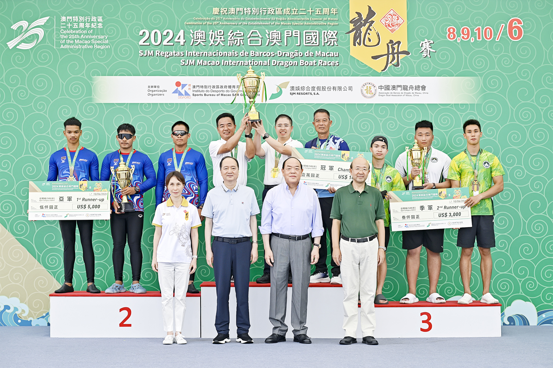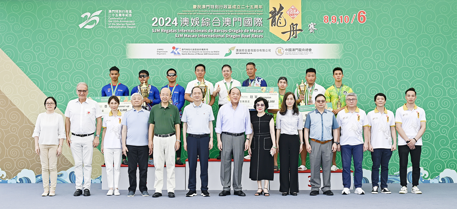 【特訊】由體育局、澳娛綜合度假股份有限公司、中國澳門龍舟總會主辦,市政署及行政公職局協辦的「慶祝澳門特別行政區成立25週年-2024澳娛綜合澳門國際龍舟賽」,昨日端午節正日於南灣湖水上活動中心進行壓軸賽事。最終中國南海九江衛冕澳門國際龍舟邀請賽標準龍500米公開組及女子組冠軍,而大學生邀請賽標準龍500米公開組由聊城大學奪得。行政長官賀一誠出席活動觀賞龍舟賽事,並主持點睛儀式及頒獎。