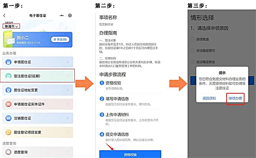 據瞭解,珠海市公安機關此次在續簽居住證採取了免交材料的新舉措。在珠海辦理了廣東省居住證的群眾同時滿足廣東省居住證到期前30天內或已過期未註銷、“粵居碼”常住地址或居住登記地址與廣東省居住證地址一致且有效兩個條件即可在網上續簽居住證。值得一提的是,系統將自動校驗續簽申請人是否符合條件。