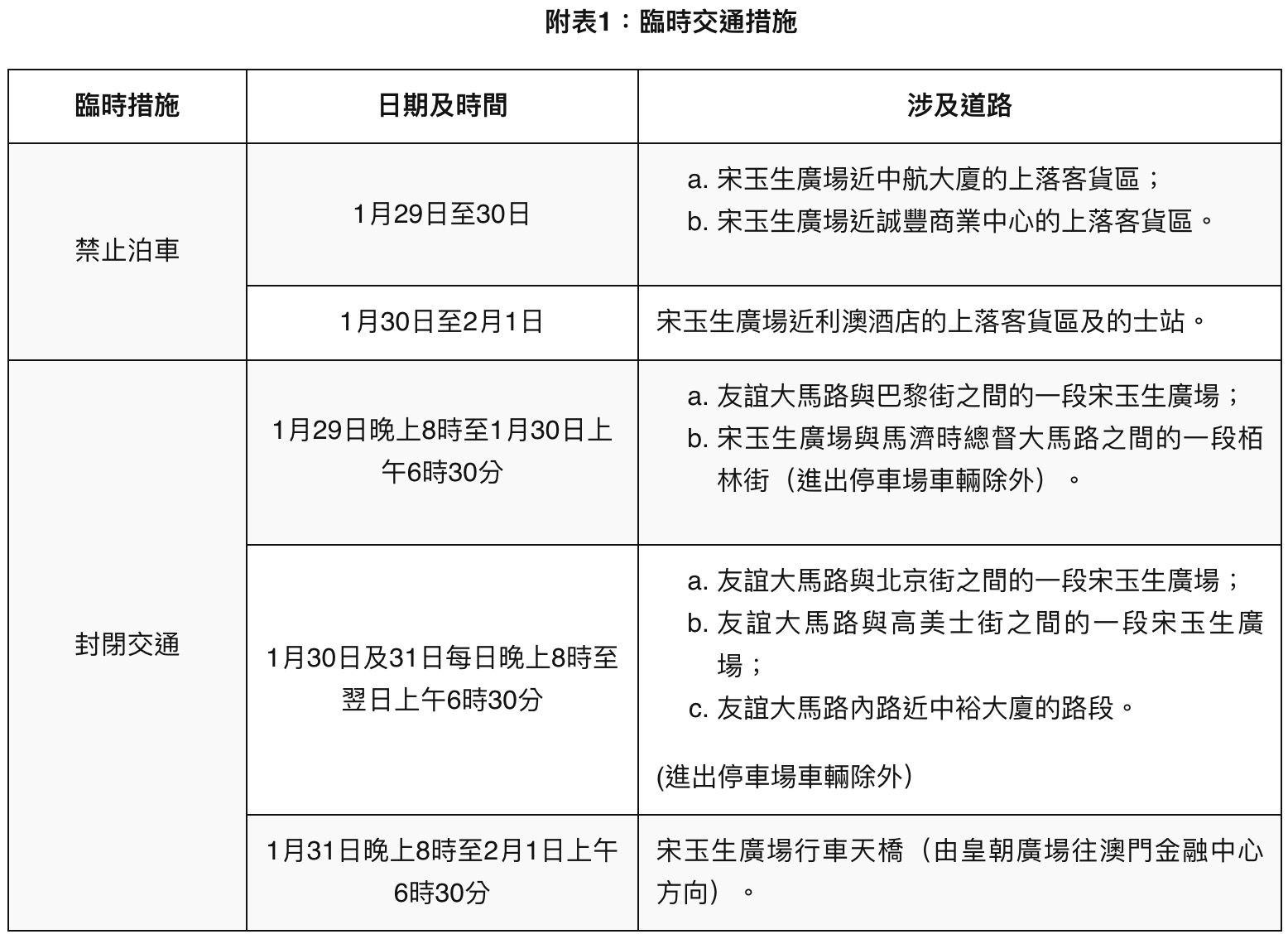 【即時新聞】因應市政署維修路面,由1月29日(周一)起至2月1日(周四),皇朝宋玉生廣場一帶將實施臨時交通管制措施,部份措施於晚間實施(詳情可查閱附表1)。