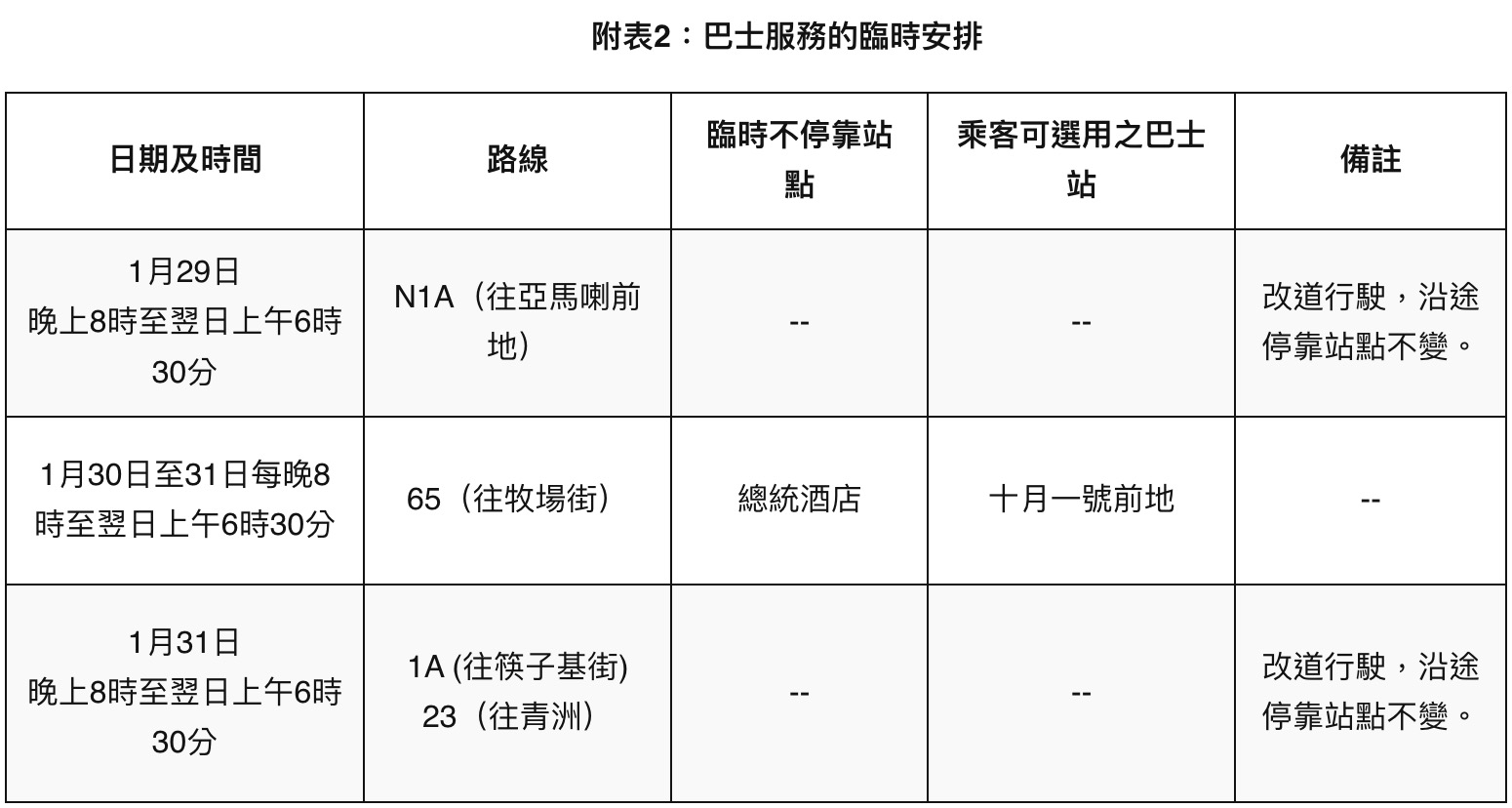 巴士服務方面,1A(往筷子基街)、23(往青洲)、65(往牧場街)及N1A(往亞馬喇前地)路線將受影響,詳情可查閱附表2或兩巴網站(www.tcm.com.mo及www.transmac.com.mo)。