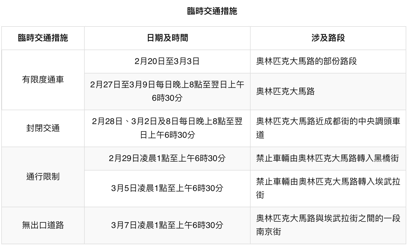【即時新聞】配合市政署重鋪路面工程,氹仔奧林匹克大馬路一帶2月20日至3月10日分階段實施臨時交管(詳情請參閱附表)。