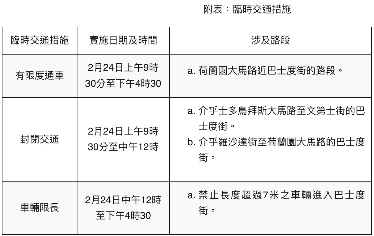 【即時新聞】因應市政署修剪樹木,荷蘭園大馬路2月24日上午9時30分至下午4時30分將實施臨時交通措施,詳情可查閱以下附表。期間,23路線(往青洲)臨時不停靠“高士德/培正”站,乘客可選用“高士德/亞利鴉架街”站上落,詳情可查閱澳巴網頁(http://www.tcm.com.mo)。