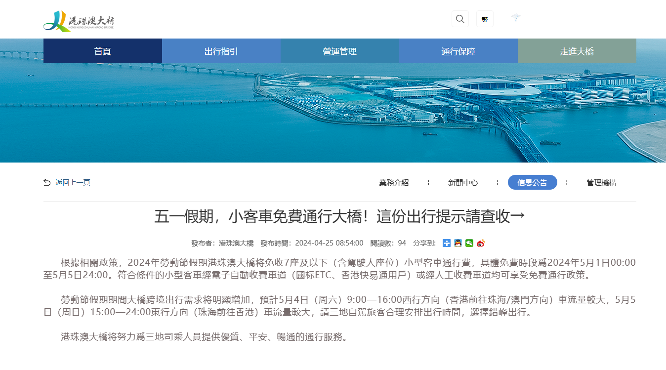 【即時新聞】從港珠澳大橋網站獲悉,五一勞動節假期港珠澳大橋将免收7座及以下(含駕駛人座位)小型客車通行費,具體免費時段爲2024年5月1日00:00至5月5日24:00。符合條件的小型客車經電子自動收費車道(國标ETC、香港快易通用戶)或經人工收費車道均可享受免費通行政策。