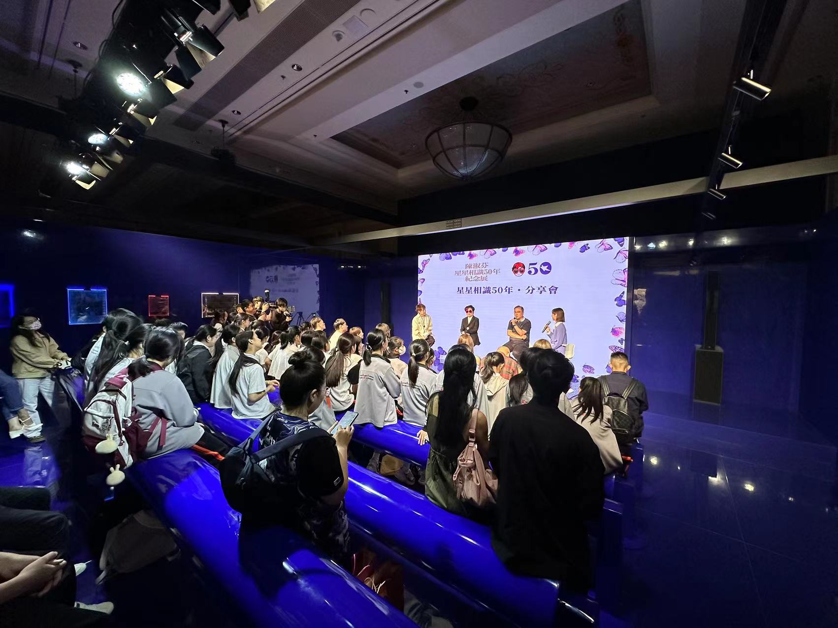 【即時新聞】《陳淑芬.星星相識50年.紀念展》自3月20日假澳門倫敦人4樓敦煌宴會廳開幕以來反應熱烈,深受市民及旅客喜愛,展期終極延長至本月28日。為了讓更多年輕人進一步瞭解行業情況,「天星娛樂」總裁兼資深製作人陳淑芬(陳太)今日下午在展場內舉行分享會,邀請澳門演藝學院約70名師生出席,分享此次辦展心得,以及回顧她與眾多明星的幕後花絮和從事演藝行業數十年來的寶貴經歷,藉此激發學生們對演藝事業的熱愛和追求。