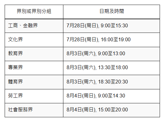 選委會委員選舉的競選活動期由2024年7月27日凌晨零時開始,至8月9日午夜12時結束;期間,管委會將於7月28日、8月3日及4日提供上述場地予各界別或界別分組候選人,以便於下表所列的指定時段自行舉辦宣傳會。
