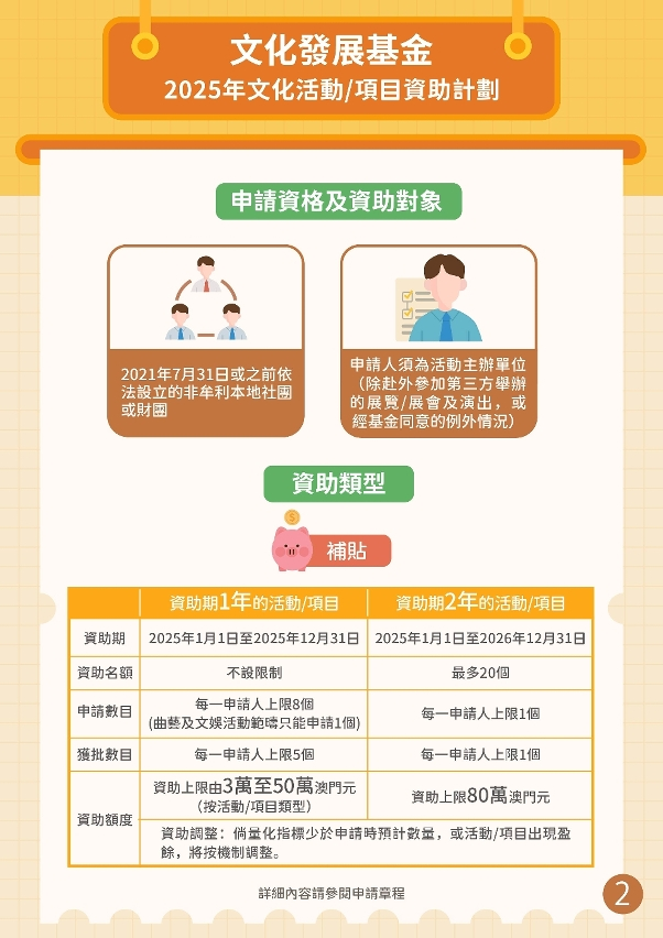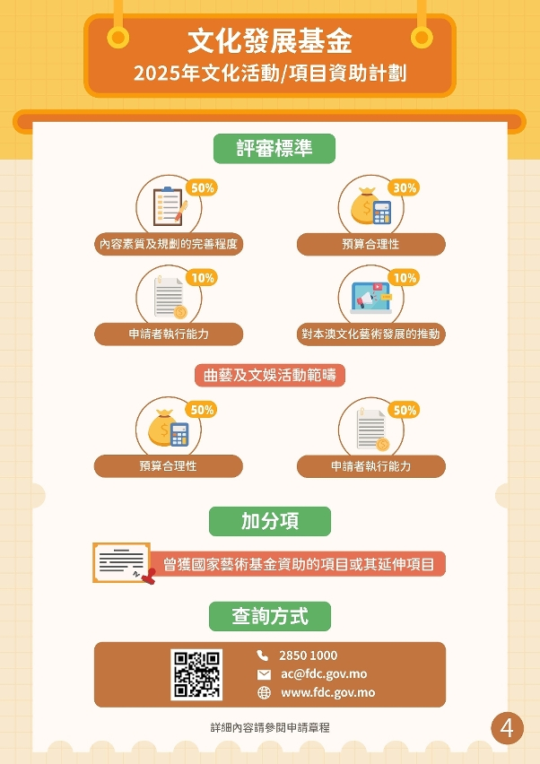 為詳細介紹“2025年文化活動/項目資助計劃”的申請事宜及解答申請人問題,基金將於7月31日下午3時假澳門科學館會議廳舉行專場講解會,有興趣人士請到基金網站(www.fdc.gov.mo)“電子服務及資訊下載區”的“報名登記系統”內報名,查詢請致電2850 1000或電郵ac@fdc.gov.mo。