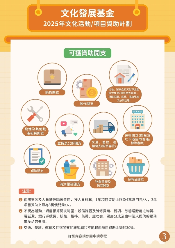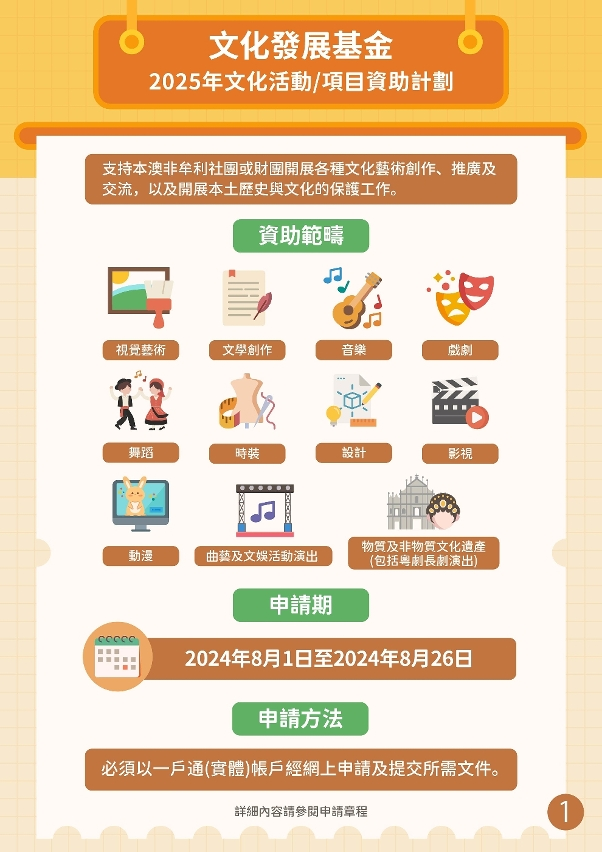 【即時新聞】文化發展基金將於8月1日至8月26日接受2025年“文化活動/項目資助計劃”的申請,資助範疇包括:視覺藝術、文學創作、音樂、曲藝(一般對唱、折子戲,形式僅限於演出)及文娛活動(金曲、流行曲,形式僅限於演出)、戲劇、舞蹈、物質及非物質文化遺產(包括粵劇長劇演出)、時裝、設計、影視及動漫相關活動和項目。