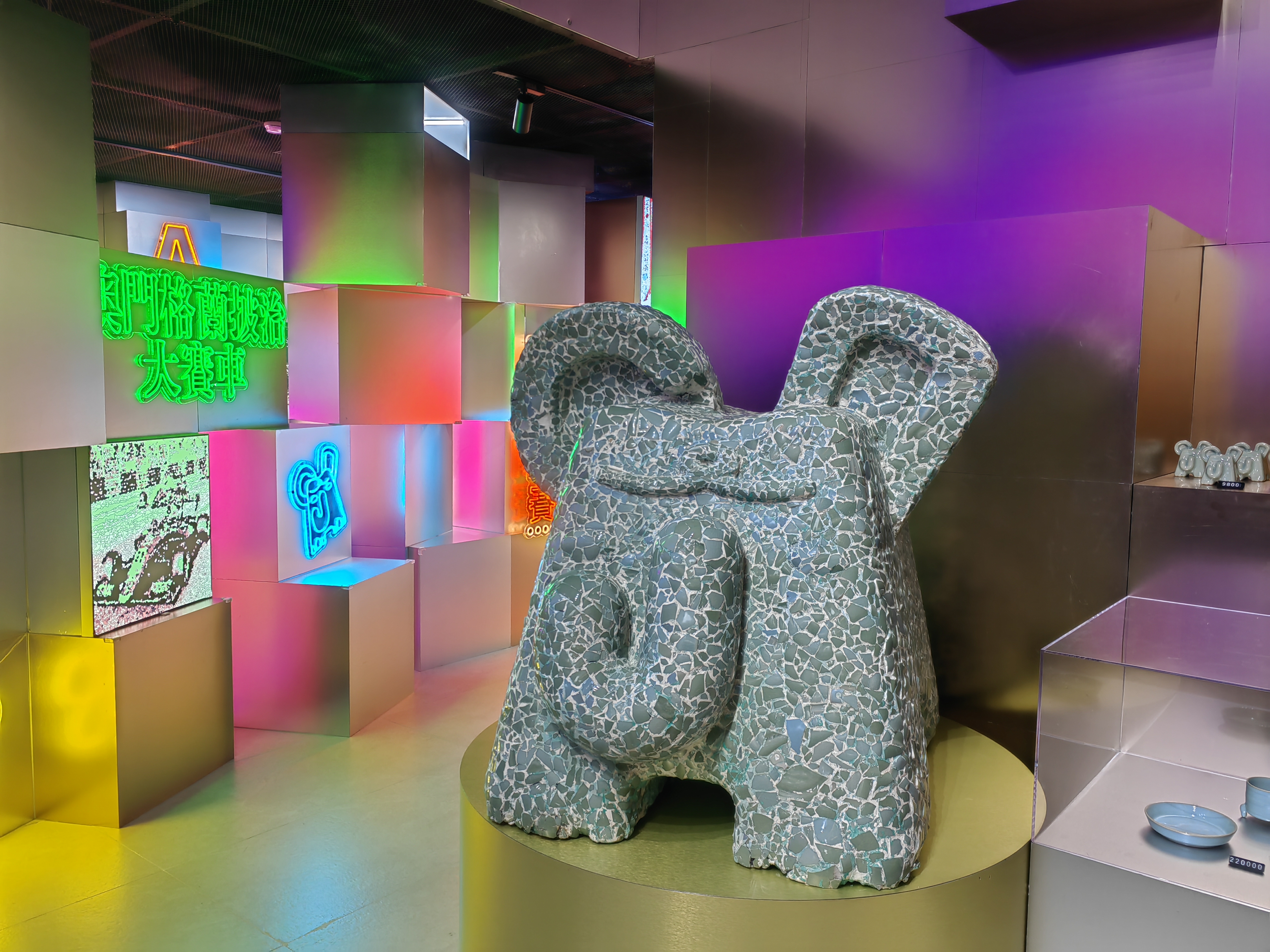 乜象與國家級非物質文化遺産項目“汝瓷燒制技藝”代表性傳承人朱文立,陶瓷藝術家、文華汝瓷創始人朱宇華合作,用汝瓷碎片拼貼創作乜象,以此呼籲大家關注傳承非遺文化;合作剪紙藝術家蔣紅麟,再現民族風視角下的紙藝乜象,以夢幻陣容打造澳門首發“乜象傳統文化系列”藝術展中展。