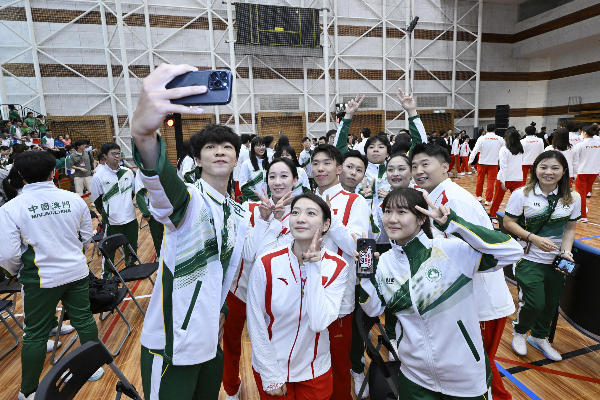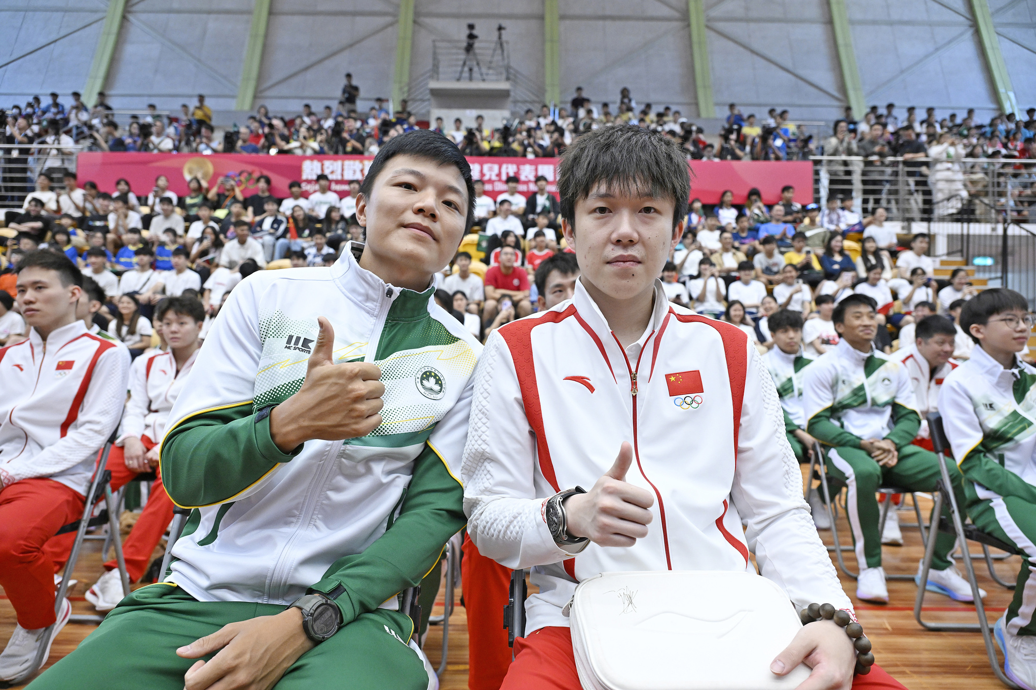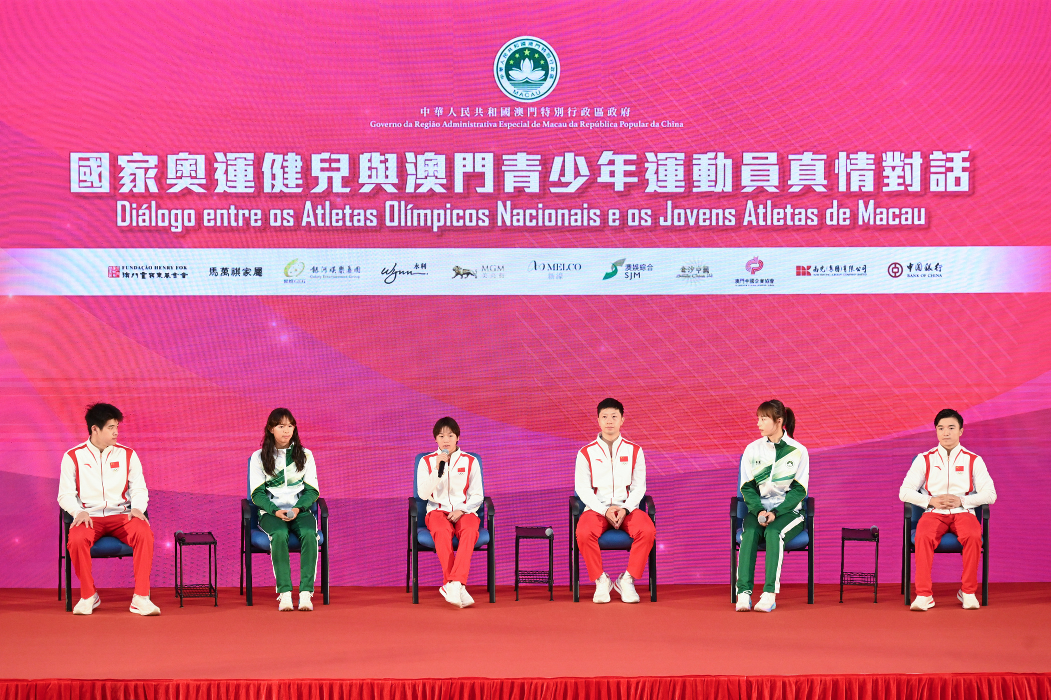 代表團一行上午10時30分出席在奧林匹克體育中心室內體育館舉行的“國家奧運健兒與澳門青少年運動員真情對話”活動,向在場600名本澳精英和集訓隊運動員、青年學生分享自身經歷,以及訓練過程的點點滴滴,並與澳門運動員進行了乒乓球和藝術體操互動交流,國家奧運健兒勉勵本澳運動員及青年要有拼搏、堅毅不屈的精神。其中,8名運動員包括馬龍、全紅嬋、曹緣、潘展樂、馮雨、郭崎琪、劉洋及李倩,與本澳運動員代表王泳欣、陳珮琳、方文浩、梁盈嵐,及現場學生和運動員真情對話,分享在奧運會奪獎、為國爭光的喜悅。