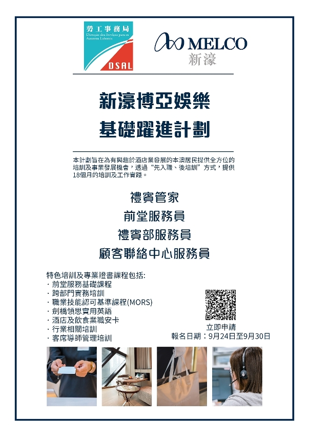 【即時新聞】為培育本地人才並提供發展階梯,勞工事務局和新濠博亞娛樂有限公司(下稱“新濠")合作推出“新濠博亞娛樂基礎躍進計劃—酒店營運"(下稱“計劃"),以“先入職、後培訓”方式,為有志投身綜合休閒旅遊服務行業的澳門居民提供全方位培訓及發展階梯,計劃由9月24日起接受申請。