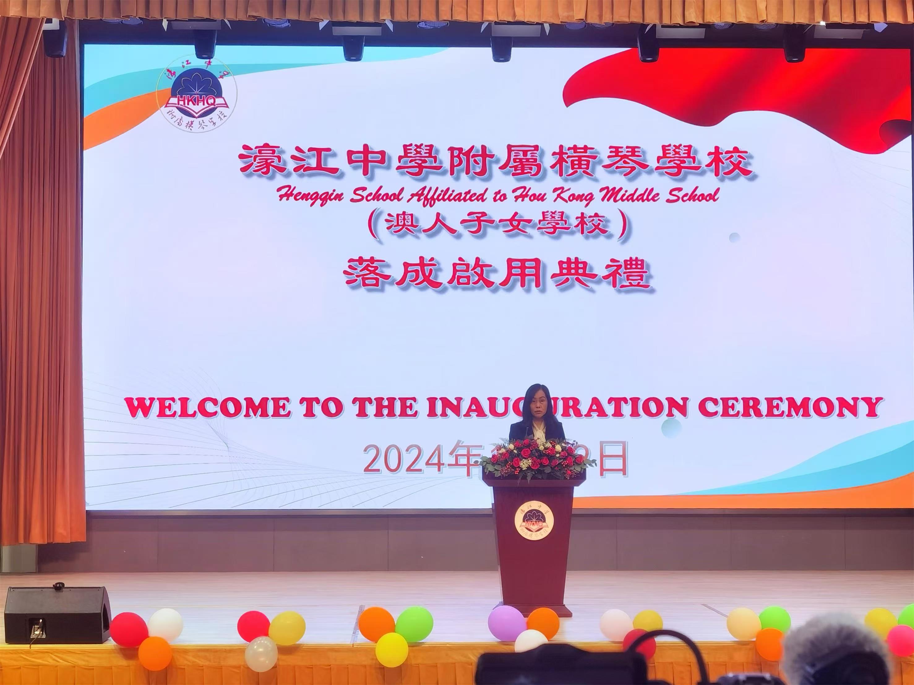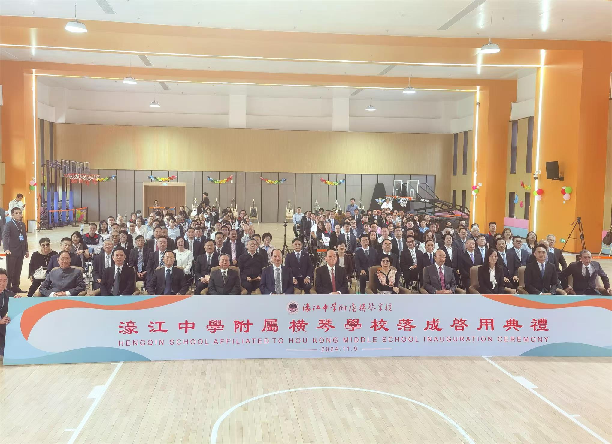 澳門行政長官賀一誠,澳門中聯辦主任鄭新聰,外交部駐澳門特派員公署特派員劉顯法,澳門立法會主席高開賢,澳門社會文化司司長歐陽瑜,深合區執委會副主任吳子健,澳門教青局局長龔志明等領導嘉賓出席並為學校主持剪綵和揭牌。