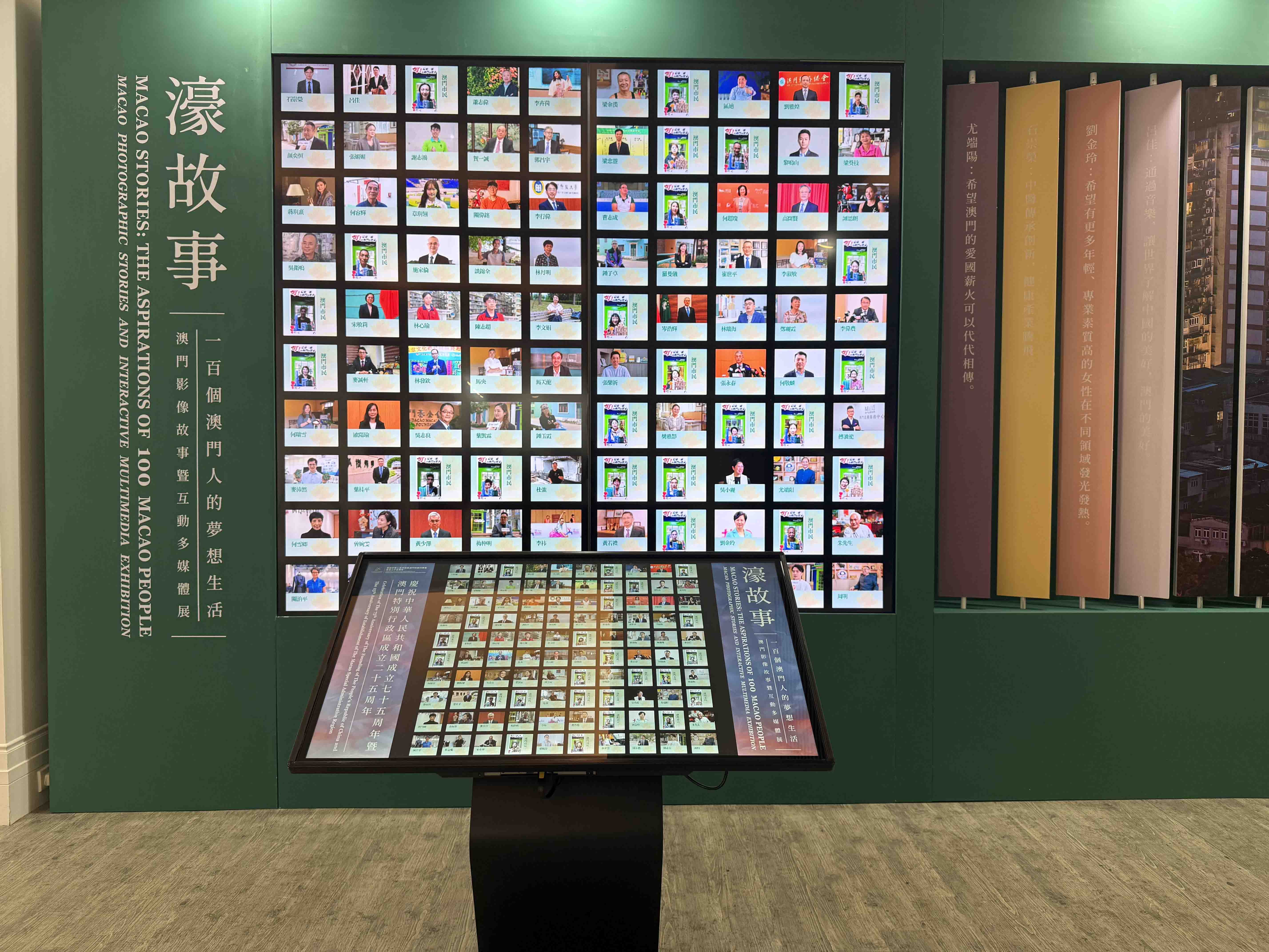 在視頻多媒體互動區域,超大螢幕上呈現100位澳門人的頭像,分別對應100條影像。參觀者通過操作立式觸控面板聯動大屏即可選擇播放影像,收看這些澳門市民25年來與澳門、祖國共成長的故事,聆聽他們對澳門和個人未來發展的期待。