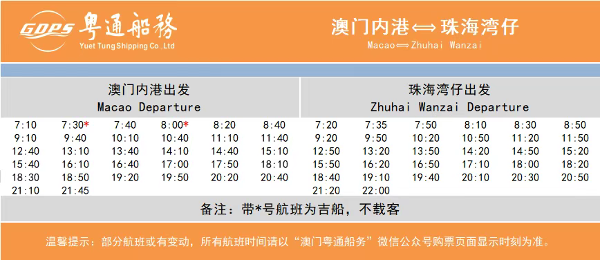 12月23日,澳門內港往來珠海灣仔航線,本澳、珠海居民及所有旅客搭船費用全免,乘客可通過公眾號購買,或親自前往內港售票處及灣仔售票處進行購票。此優惠船票僅適用於12月23日內使用。