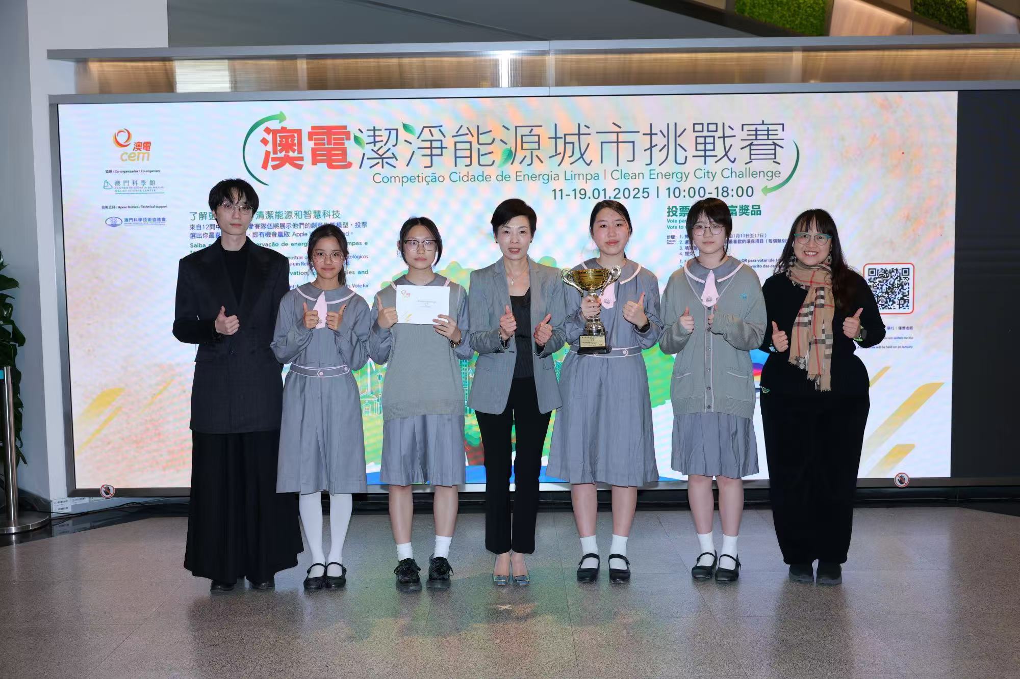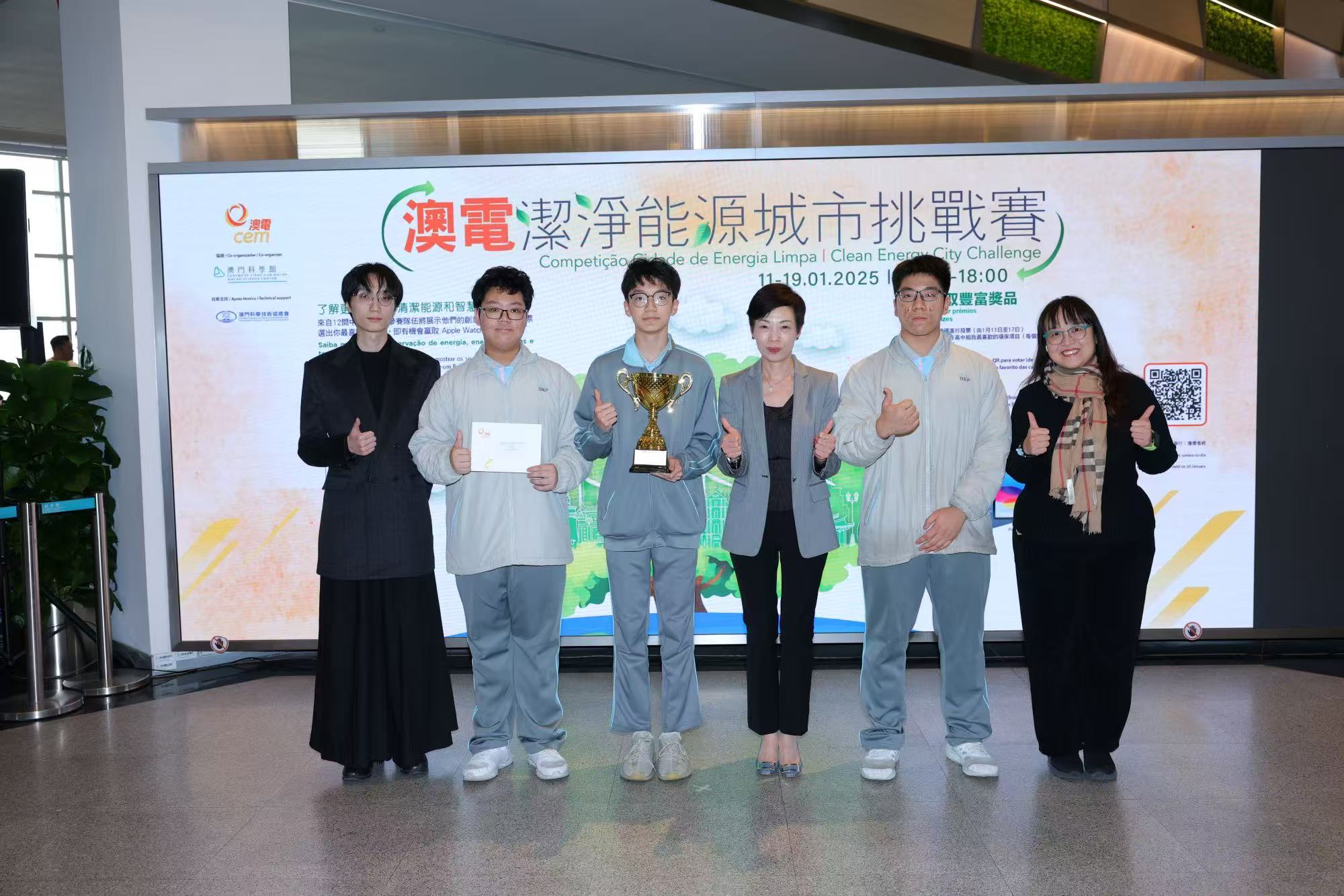 【即時新聞】澳電與澳門科學館合辦,獲澳門科學技術協進會提供技術支持的第三屆潔淨能源城市挑戰賽,以「減碳,我們做得到!」為主題,旨在提升學生對環保及清潔能源應用的興趣。來自14間本地中學組成43支隊伍近300名學生報名參賽,收到超過5千份公眾投票,最終賽果由濠江中學附屬英才學校的隊伍包攬初中組及高中組兩個組別之冠軍寶座。