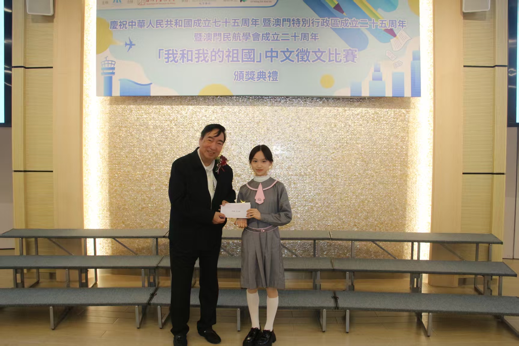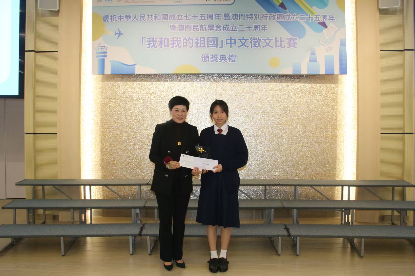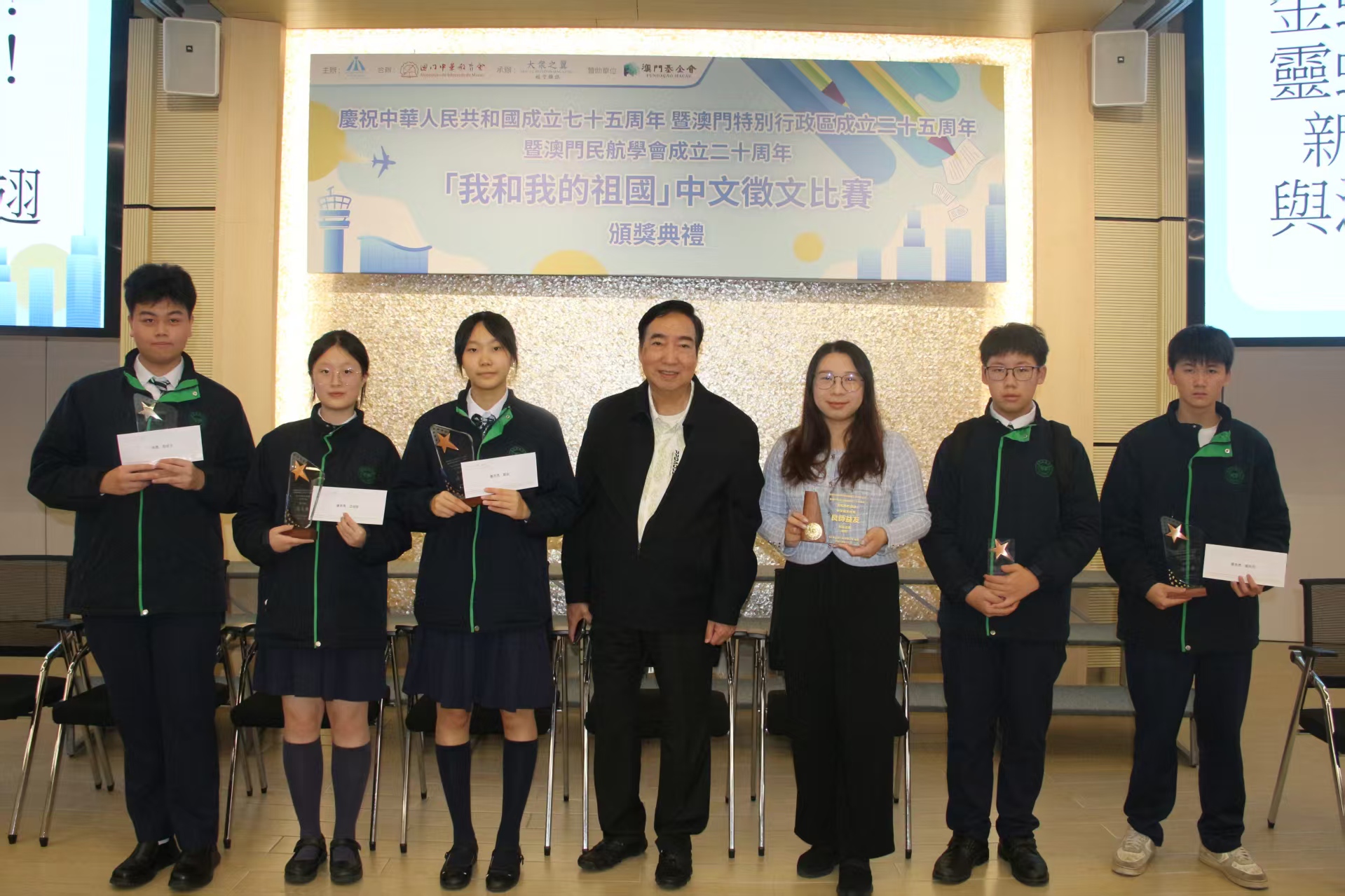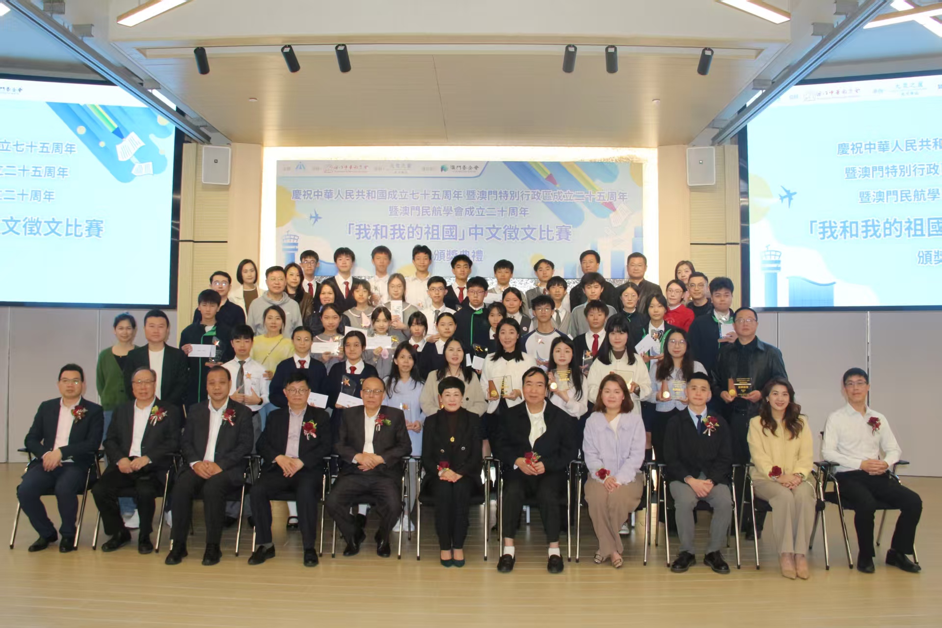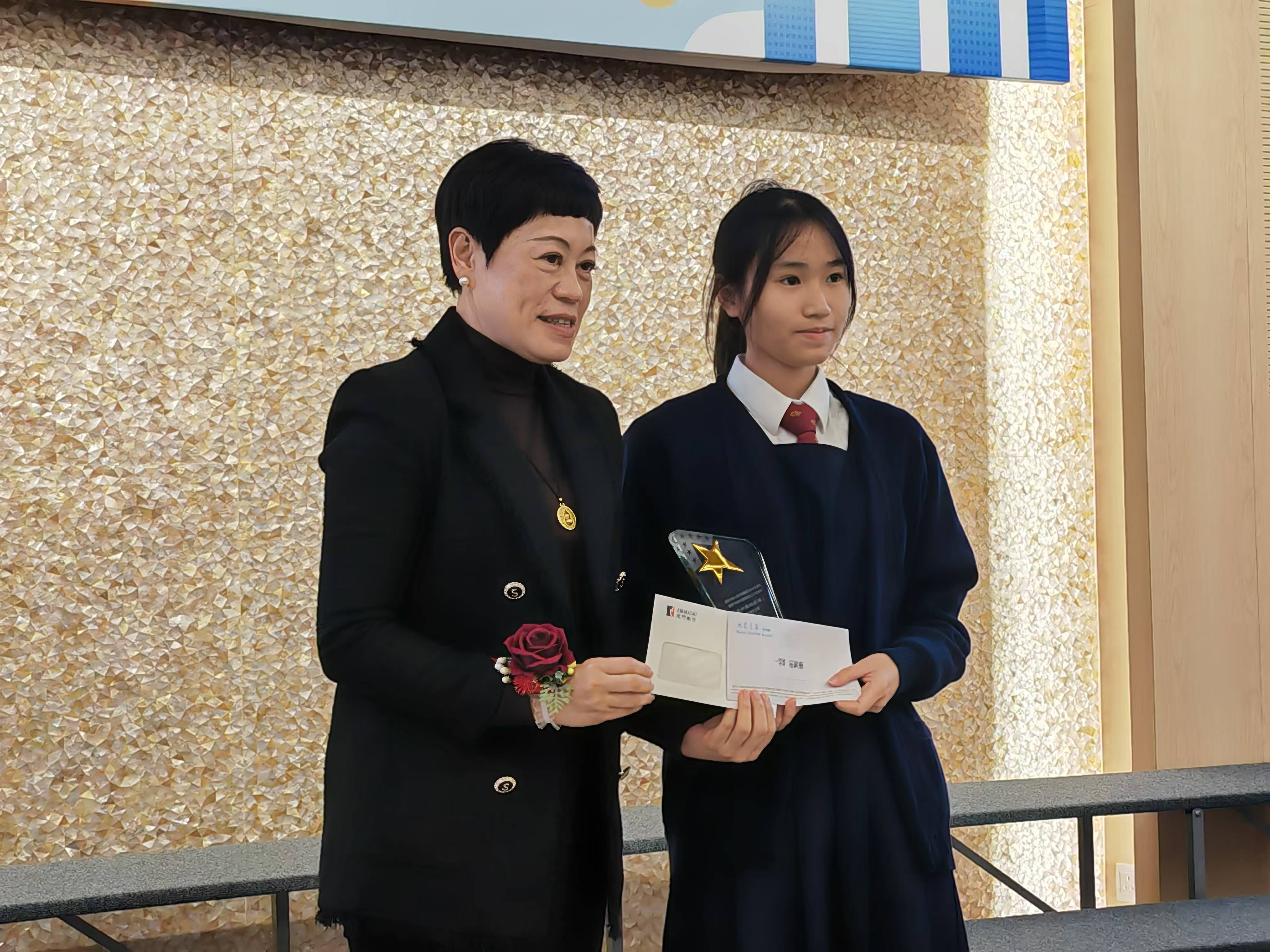【即時新聞】為慶祝中華人民共和國成立七十五周年、澳門特別行政區成立二十五周年以及澳門民航學會成立二十周年,由澳門民航學會主辦,澳門中華教育會合辦,《大眾之翼》航空雜誌承辦,澳門基金會贊助的「我和我的祖國」中文徵文比賽今日頒獎,比賽分初中、高中兩組,合共收到150份作品,由濠江中學附屬英才學校學生吳子晴獲得初中組冠軍,以及濠江中學學生區嘉蕙獲得高中組冠軍。