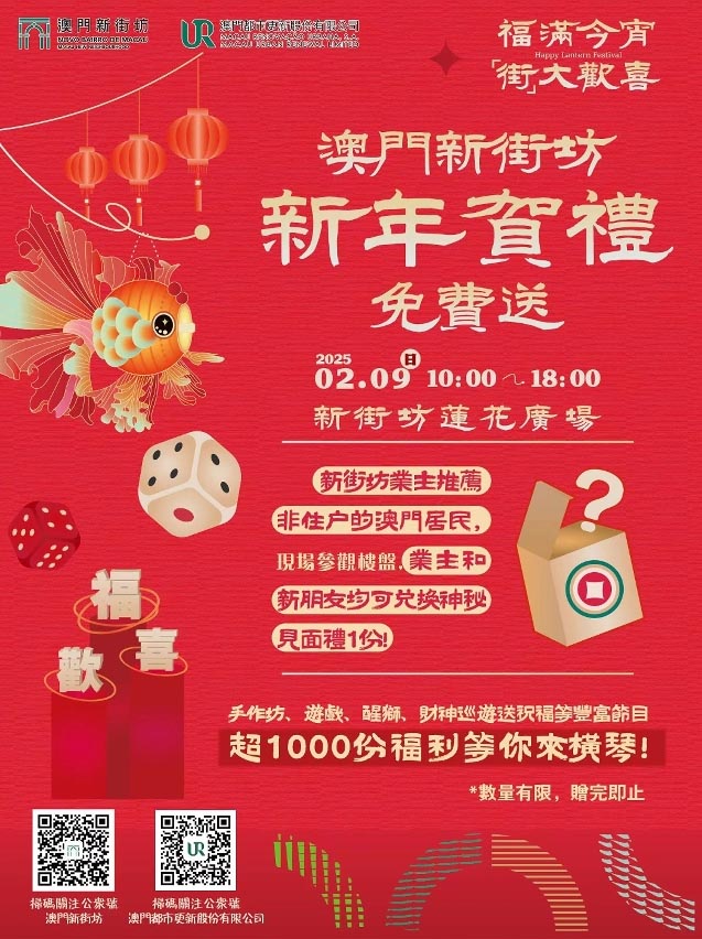 為歡迎更多市民同慶佳節,共度新街坊愉快時光,只要是新街坊業主攜同非住戶的澳門居民參加活動,均享神秘見面禮乙份,以答謝市民的支持。現場設有多個年味遊戲攤位,齊來贏取各式各樣「好意頭」獎品,獎品數量有限,送完即止。