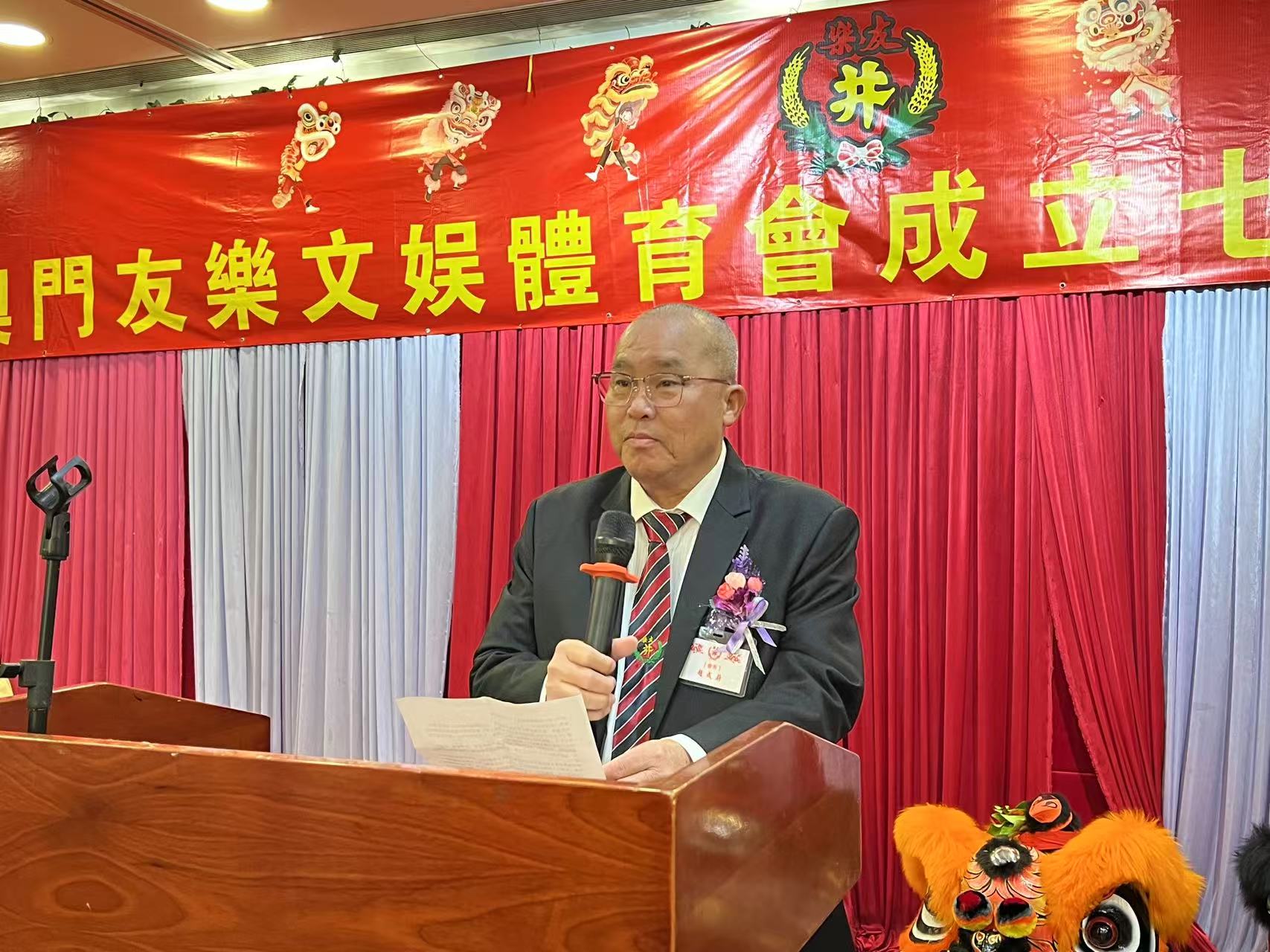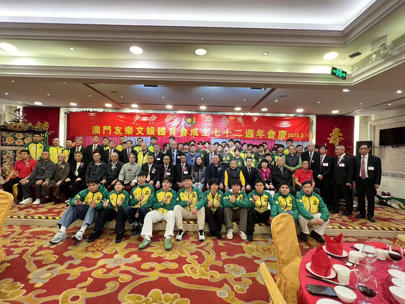 【即時新聞】澳門友樂文娛體育會今晚舉行慶祝成立七十二周年會慶聯歡晚宴,永遠會長文漢、會長趙成蔚、總監葉永源、理事長楊有成勉勵全體成員再接再厲,秉承初心,弘揚及傳承中華武術文化,為澳門社會繁榮穩定、慈善公益及體育事業發展獻力。