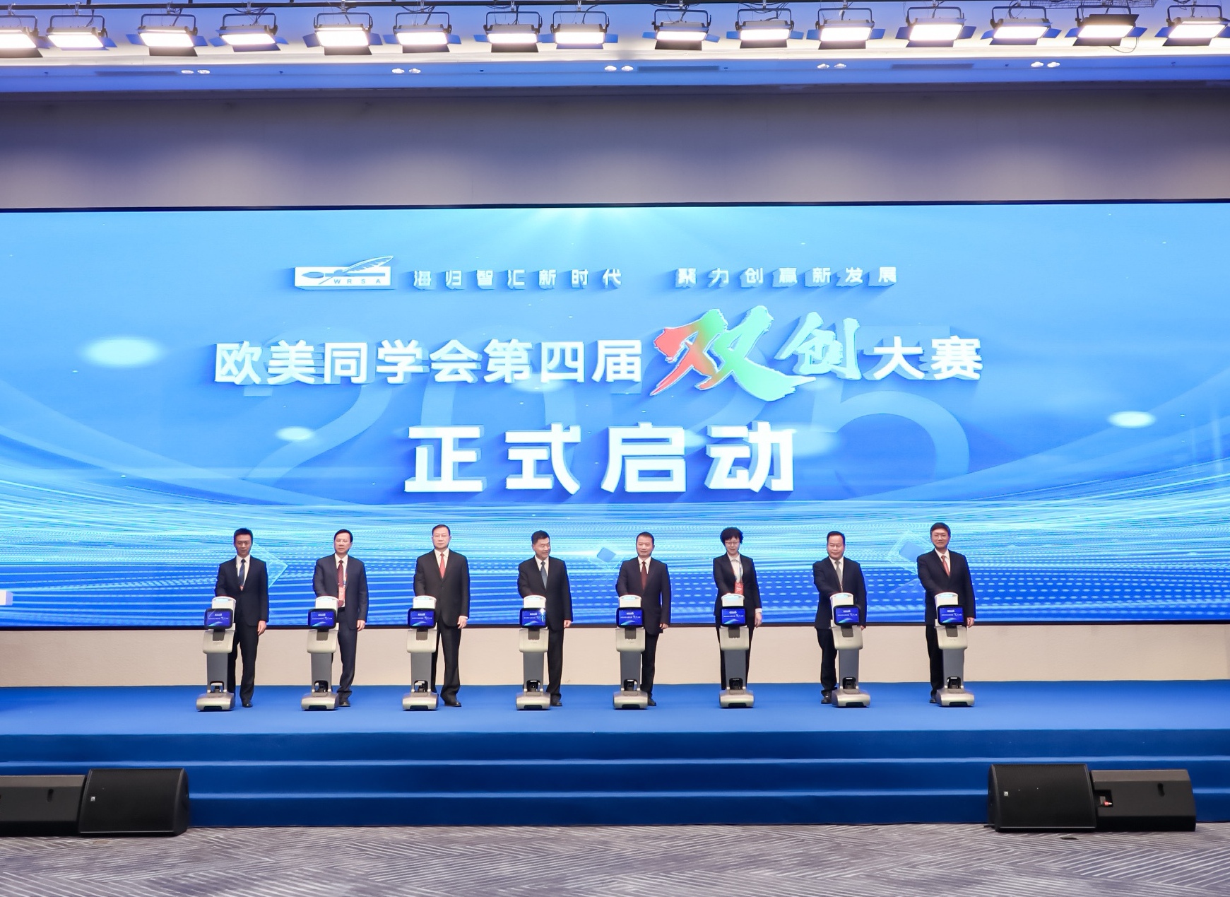 現場,李民、姜員平、郭才武、辛靜、余傑、鄭宗有、黃永明、趙適劍共同啟動歐美同學會第四屆“雙創”大賽。