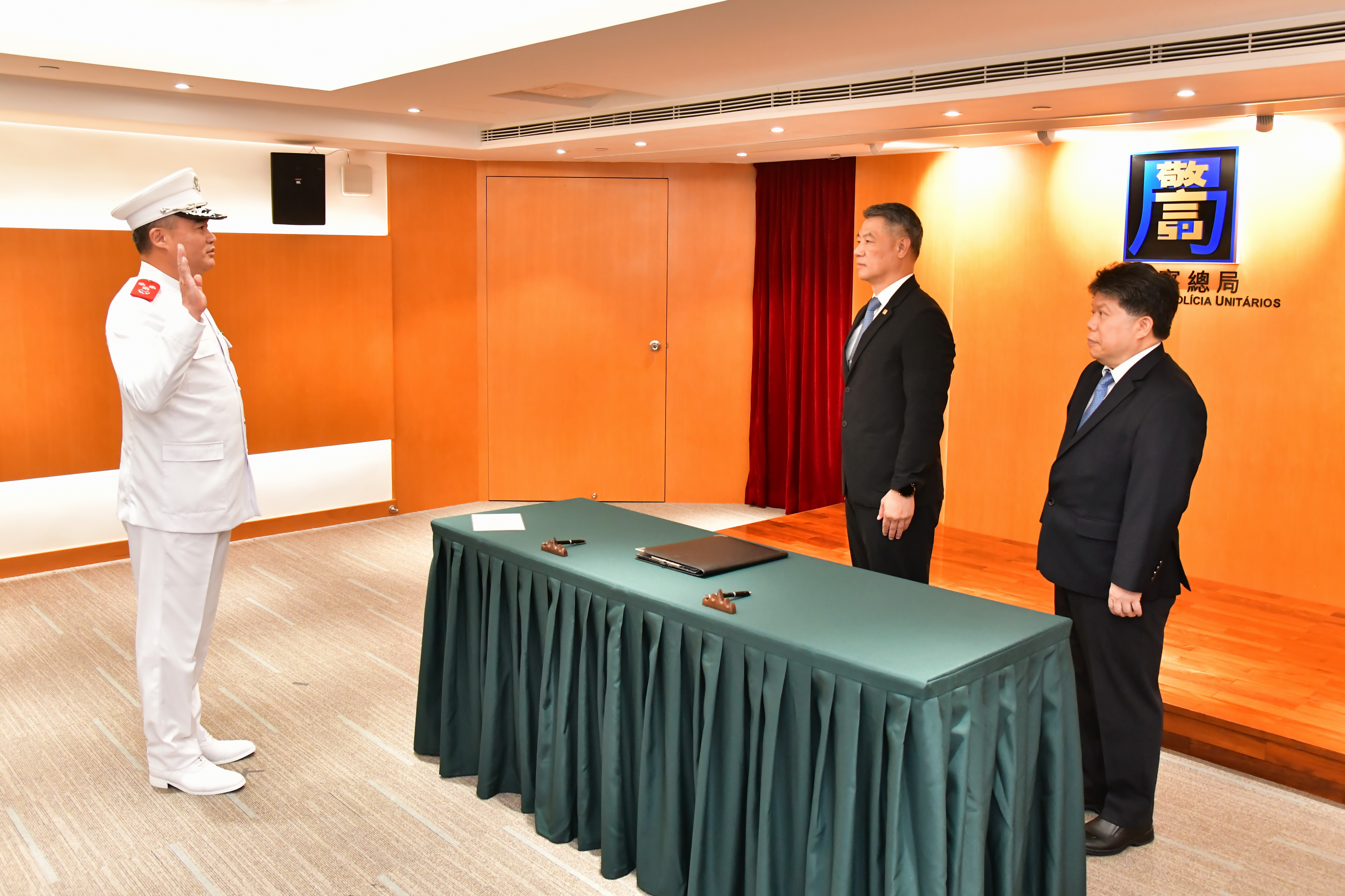 【即時新聞】根據保安司司長批示,自2025年7月16日起,委任治安警察局警務總長魏瑞斌為警察總局局長助理,賦予副警務總監的職能職位,主管情報分析中心;以及委任消防局消防總長林俊生為警察總局局長助理,賦予副消防總監的職能職位,主管民防及協調中心。就職儀式於今(16日)在警察總局舉行,由警察總局局長梁文昌主持儀式,兩位局長助理宣誓就任。出席儀式人員還包括警察總局局長助理梁文照、局長辦公室協調員趙汝民、金融情報辦公室副主任馮婉琪以及各部門主管及同事。