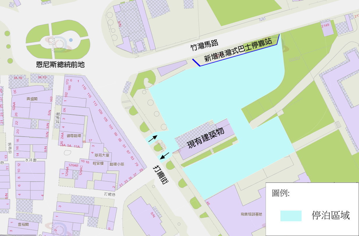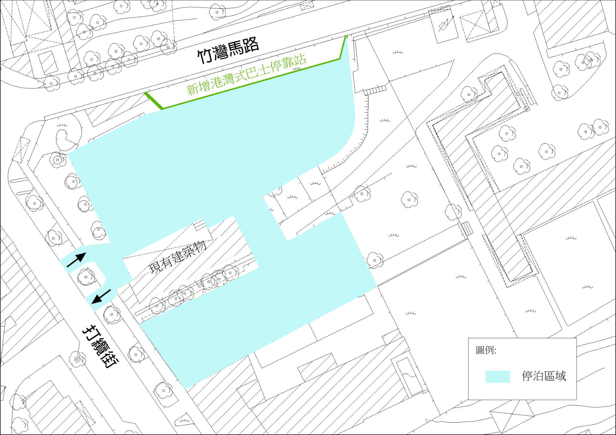 有關地段面積約5,300平方米,其中可用作泊車的空間主要位於場地內南北兩端較空曠位置,合共約3,000平方米。工程的施工內容包括平整場地內南北兩端區域作泊車空間;重整面向打纜街的圍牆及設置車輛進出口;於竹灣馬路近臨時停車場一側設置港灣式巴士停靠站點;於場地內加設照明、電訊等設施,並完善現有的供排水系統等。