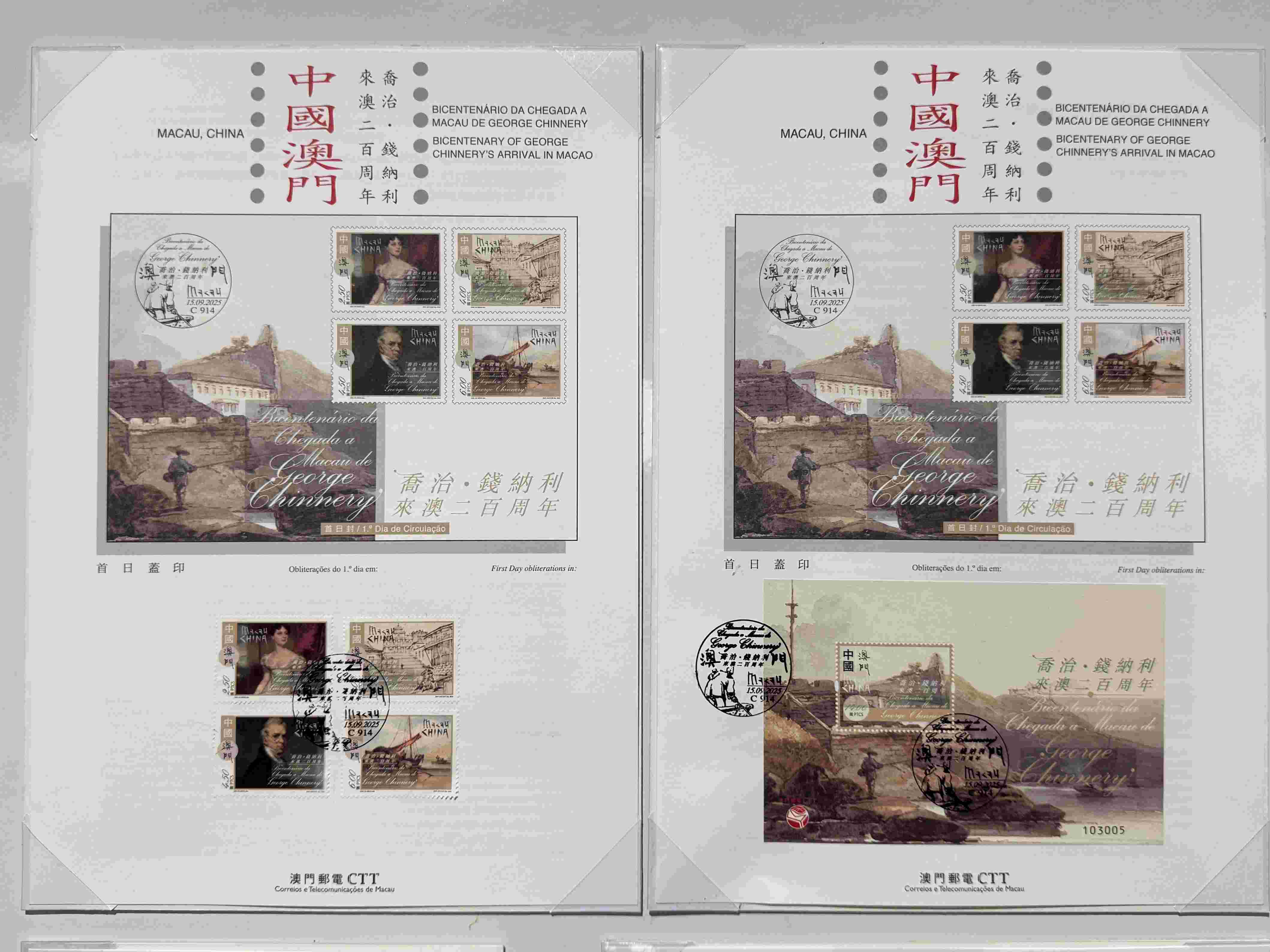 【即時新聞】郵電局將於後日(3日)及本月十五日發行以“中國人民抗日戰爭暨世界反法西斯戰爭勝利80周年”及“喬治•錢納利來澳二百周年”為題的新郵品。