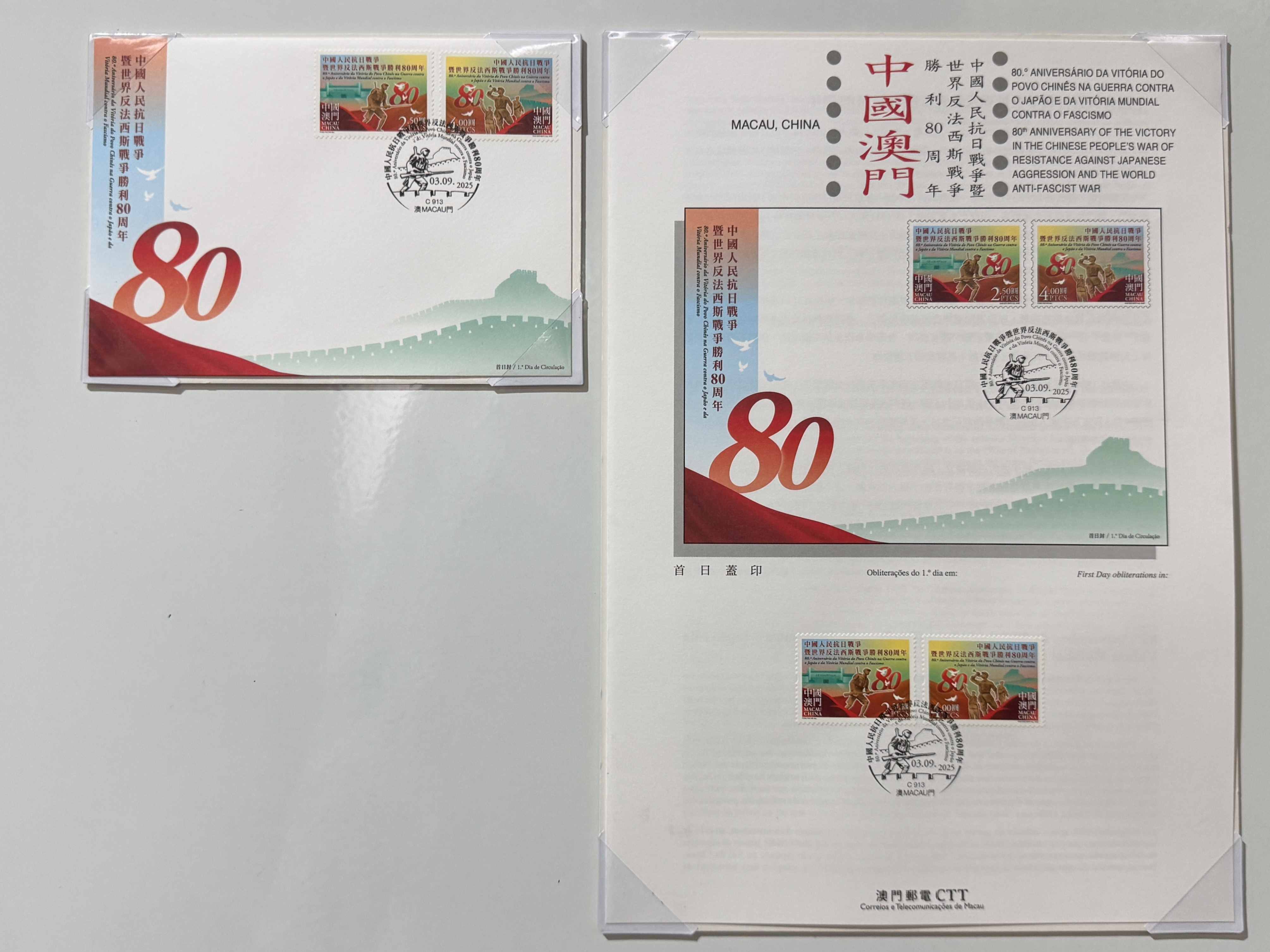 新郵品“中國人民抗日戰爭暨世界反法西斯戰爭勝利80周年”將於本週三發行。是次發行包括兩枚郵票,以抗日紅軍英姿作為視覺重心,展現中國軍民在抗戰時期的雄心壯志。將士們昂首挺胸,朝向白鴿飛翔的光明方向,勇敢無懼邁向和平之路。郵票背景分別選用中國人民抗日戰爭紀念館和萬里長城,紀念英勇的抗日戰士為國捐軀的不朽功績,同時彰顯保家衛國的堅定決心。