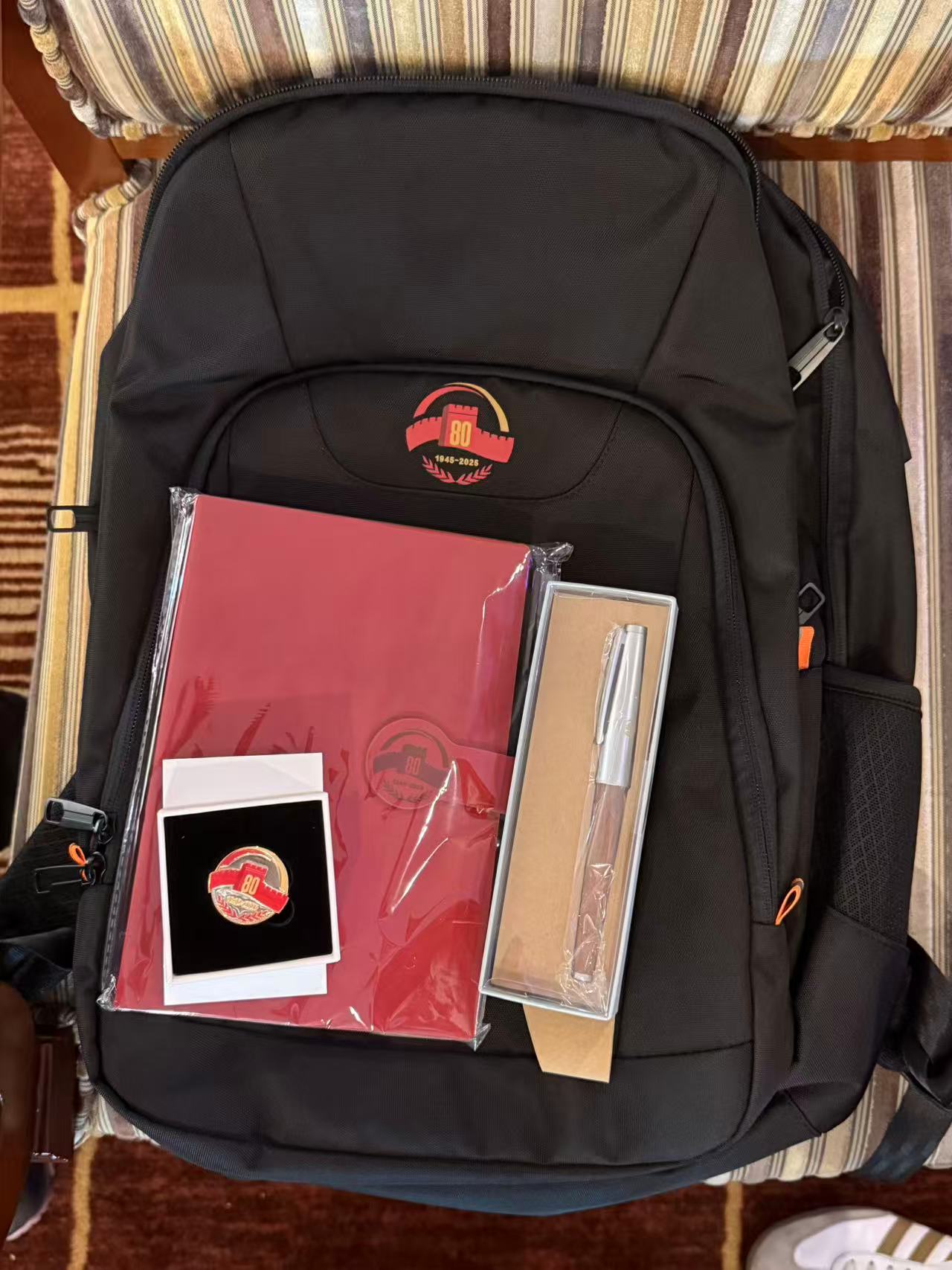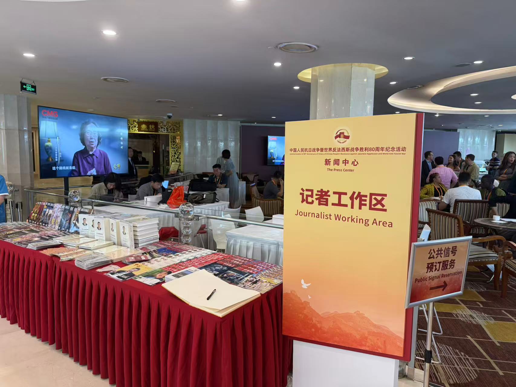 在中外媒體抵達北京這幾天,新聞中心還溫馨提供「記者包」,包含雙肩包、筆、本、徽章;新聞中心還設有總台文創精品店及郵政文創售賣區,推出以抗戰勝利80周年為主題的冰箱貼、郵票、紀念幣等特色文創產品,給記者採訪期間帶來溫馨及便利。