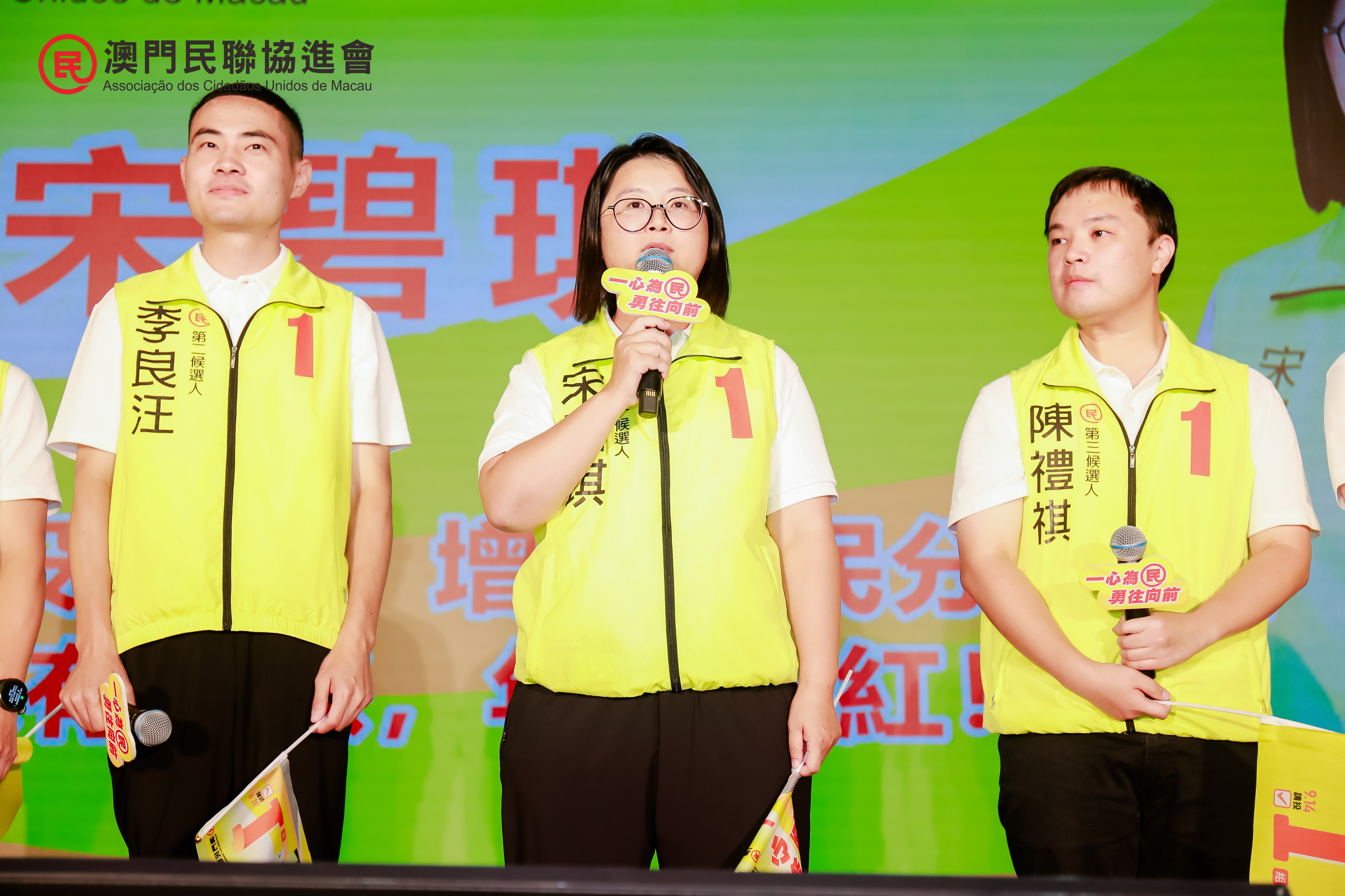 候選人宋碧琪表示,民聯團隊自2005年起進入議會,持續為市民服務20年,感謝市民長期以來的支持。而今年的參選團隊由20位年輕優秀成員組成,平均年齡32.9歲,是六個組別中最年輕的一支。團隊始終以實際行動支持青年發展,不僅停留在口頭,而是帶領青年人參與社會服務,提供發展機會。她指出,當前青年面臨創業、就業及工作與家庭平衡等挑戰,強調會將有關問題反映給政府,以爭取更好的發展環境和權益保障,並主張政府在財政盈餘充足的情況下,設立產業投資基金,透過基金引導產業聚集,進而促進本澳多元產業發展,同時要求產業基金具有全民屬性,讓所有澳門青年都能受益,得到更好的福利保障。