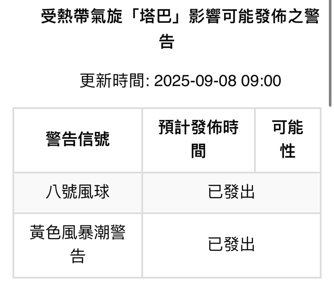 此外,受天文大潮疊加風暴潮影響,今早潮位曾達3.7米,預料今日(8日)早上內港一帶有機會出現0.5米左右水浸。當潮位出現回落,氣象局將適時改發藍色風暴潮警告。