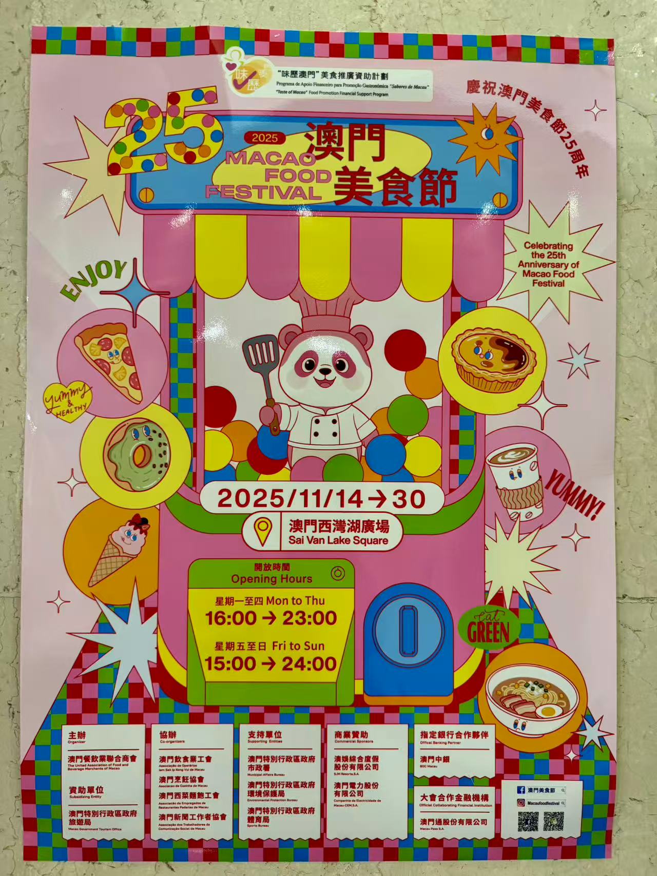 【即時新聞】「第二十五屆澳門美食節」 將於2025年11月14日至11月30日,一連十七天假「澳門西灣湖廣場」舉行。本屆美食節由澳門餐飲業聯合商會主辦,澳門飲食業工會、澳門新聞工作者協會、澳門烹飪協會及澳門西菜麵飽工會協辦,澳門特別行政區政府旅遊局、市政署、環保局、體育局及衛生局支持。