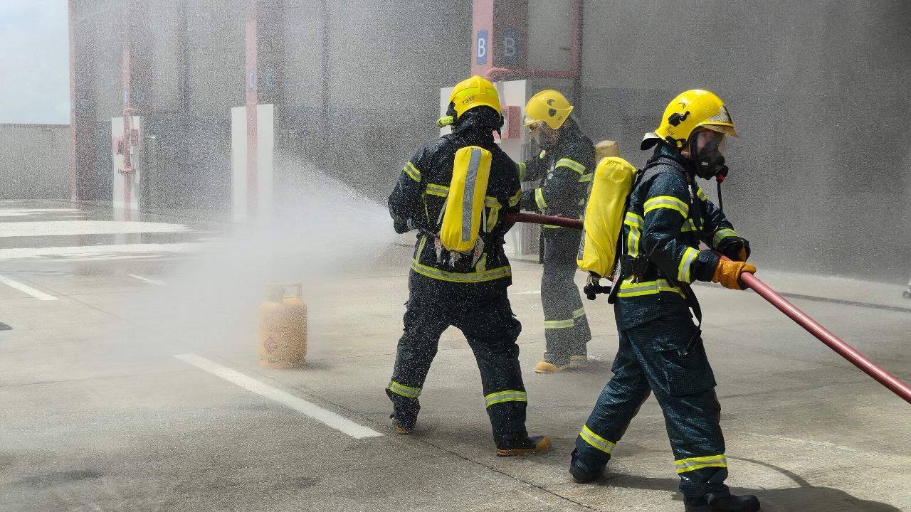 消防局接報後,隨即派遣7輛緊急車輛及26名隊員趕赴現場,按照既定計劃開展滅火及疏散行動,分別對洩漏起火的氣瓶進行降溫、覆蓋及堵截溢漏的火水、搜索現場環境、進駐消防控制室監測消防系統運作。同時,救護員在疏散集合點清點人數,並對該名跌倒受傷駕駛員進行護理後模擬送院治理。