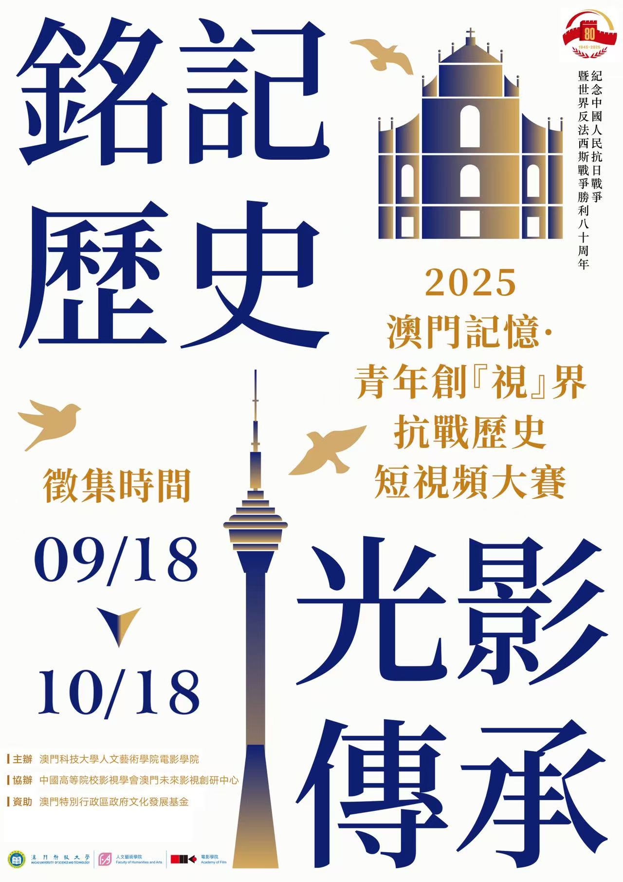 【即時新聞】為紀念中國人民抗日戰爭暨世界反法西斯戰爭勝利八十週年,由澳門科技大學人文藝術學院電影學院主辦,中國高等院校影視學會澳門未來影視創研中心協辦,並獲澳門特別行政區政府文化發展基金資助的「銘記歷史 光影傳承」澳門記憶·青年創『視』界抗戰歷史短視頻大賽於今日正式發布比賽總章程,並預告將於9月19日舉行盛大啟動儀式。