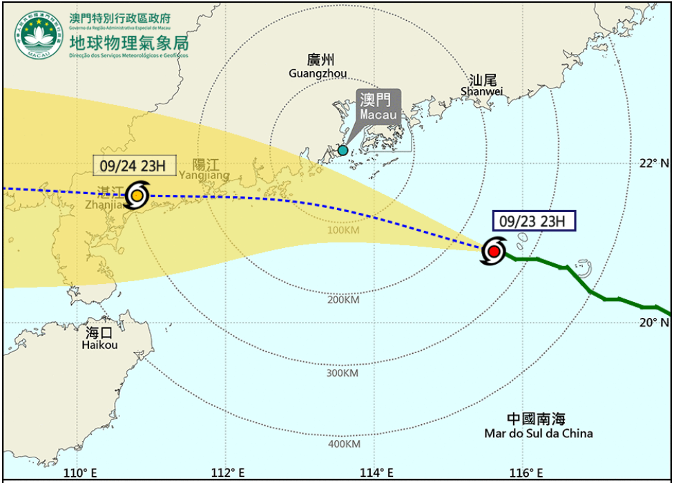 預測「樺加沙」明日(24日) 凌晨至早上將會相當接近珠江口,預計會於本澳100公里內掠過,屆時本澳風力有機會達12級颶風或以上,最大風力持續時間較長,有狂風暴雨及雷暴,高層樓宇需提防因颶風或以上風力所帶來的嚴重影響。明日(24日)凌晨2時至4時改發九號風球機會為高,同日清晨4時至7時改發十號風球機會亦高。