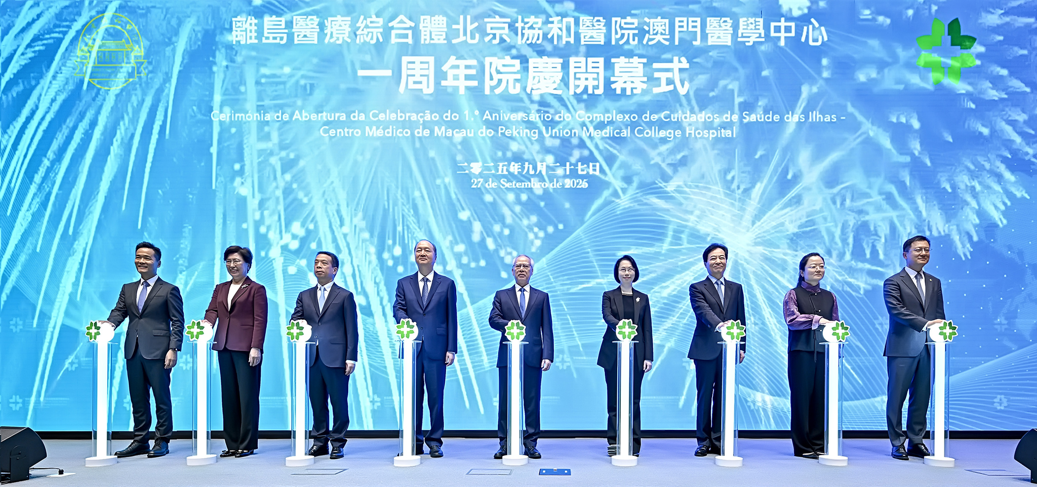 【即時新聞】離島醫療綜合體北京協和醫院澳門醫學中心(下稱“協和澳門醫學中心”)於今(27)日舉行周年院慶開幕式及〝第二屆澳門協和學術周〞活動,澳門特別行政區岑浩輝行政長官、中聯辦鄭新聰主任、社會文化司柯嵐司長、中聯辦黃柳權副主任、北京協和醫院名譽院長趙玉沛院士、北京協和醫院張抒揚院長、國家衛生健康委員會港澳台辦張曉博處長、衛生局羅奕龍局長及協和澳門醫學中心吳文銘院長共同擔任開幕式的主禮嘉賓。
