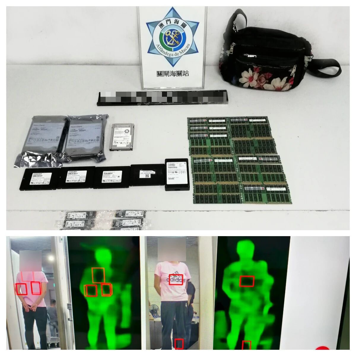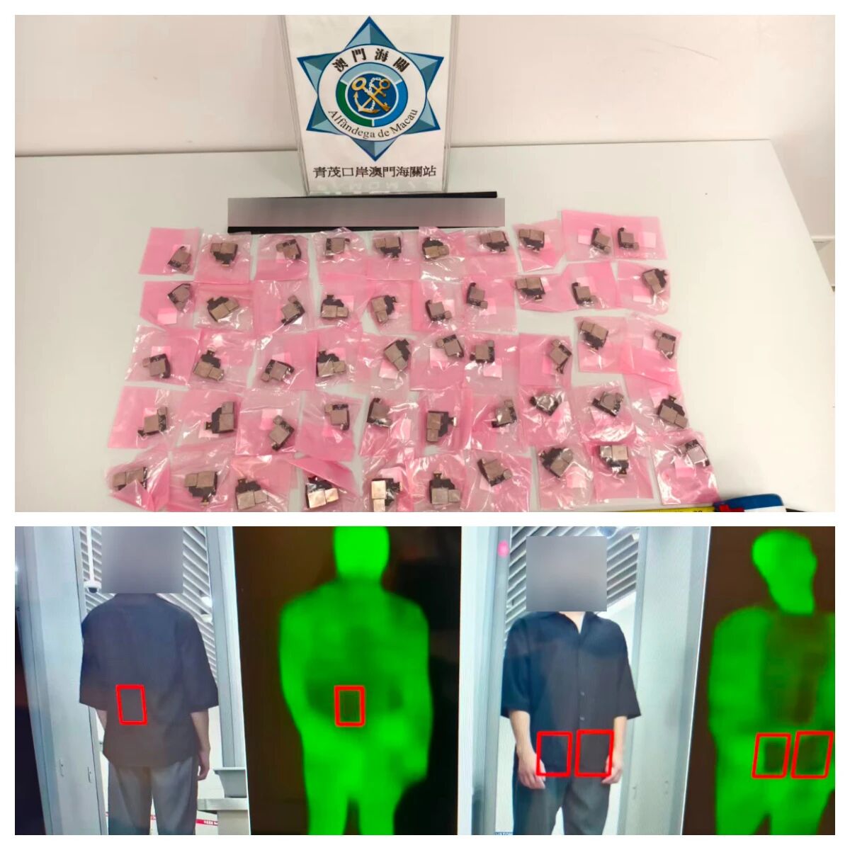 同日在青茂口岸出境旅客檢查區發現一名男性內地居民,其腹部鼓脹,懷疑藏有未申報物品。經檢查,發現該男子將50件舊電子零件纏於腹部,其試圖將之偷運出境。