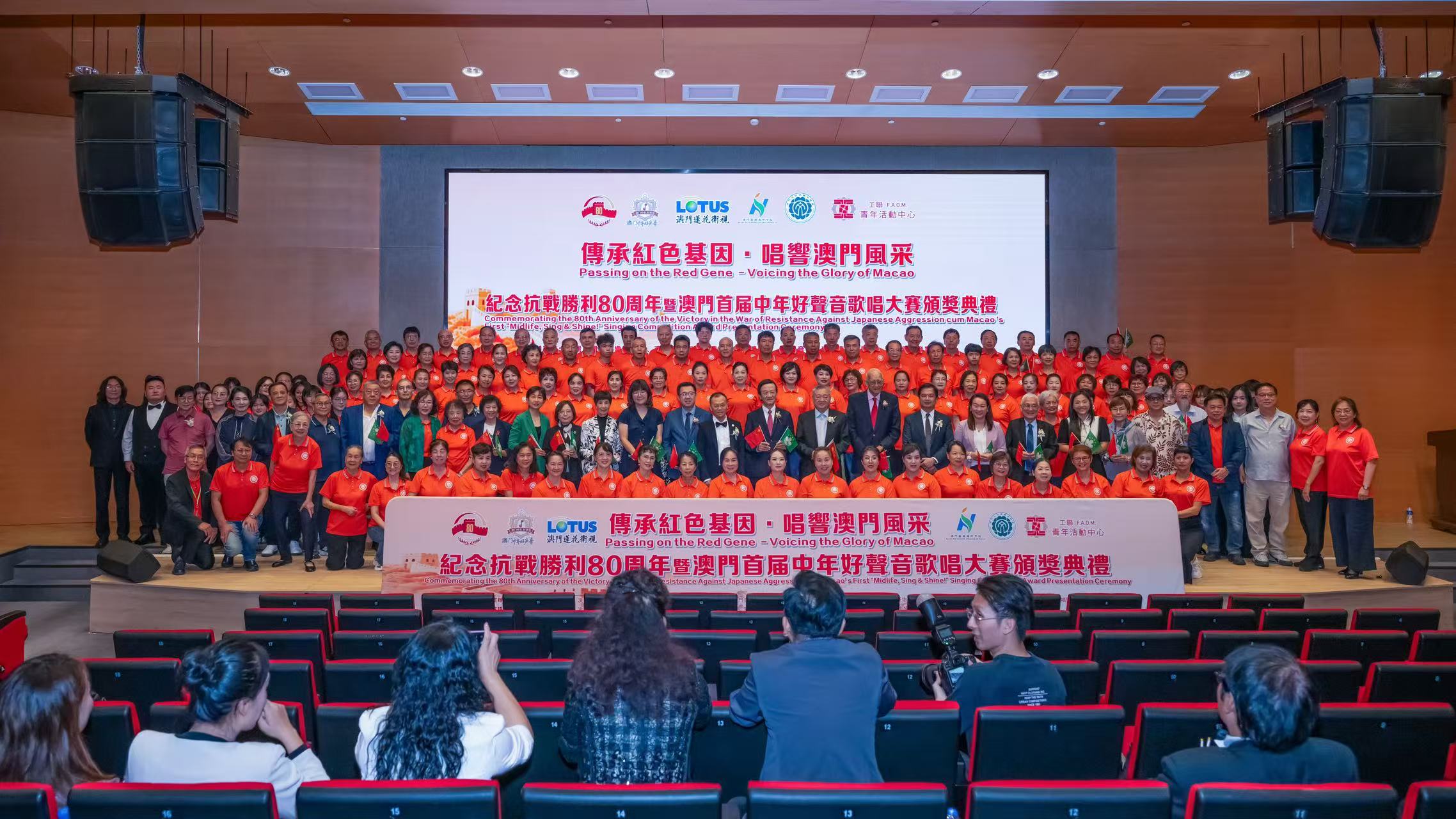 【即時新聞】在紀念中國人民抗日戰爭暨世界反法西斯戰爭勝利80周年的重要節點,“傳承紅色基因唱響澳門風采——澳門首屆中年好聲音歌唱大賽頒獎典禮” 9月30日下午在澳門鏡湖護理學院大禮堂盛大啟幕。由山西長治市合唱團、澳門音樂促進健康研究學會合唱團、澳門華夏合唱團、澳門鏡湖護理學院合唱團四團攜手組成的120人晉澳聯合合唱團,以恢弘歌聲緬懷革命先烈、傳遞家國情懷,成為整場典禮最震撼人心的高光時刻。