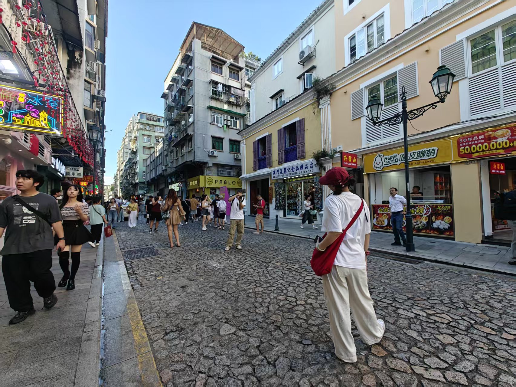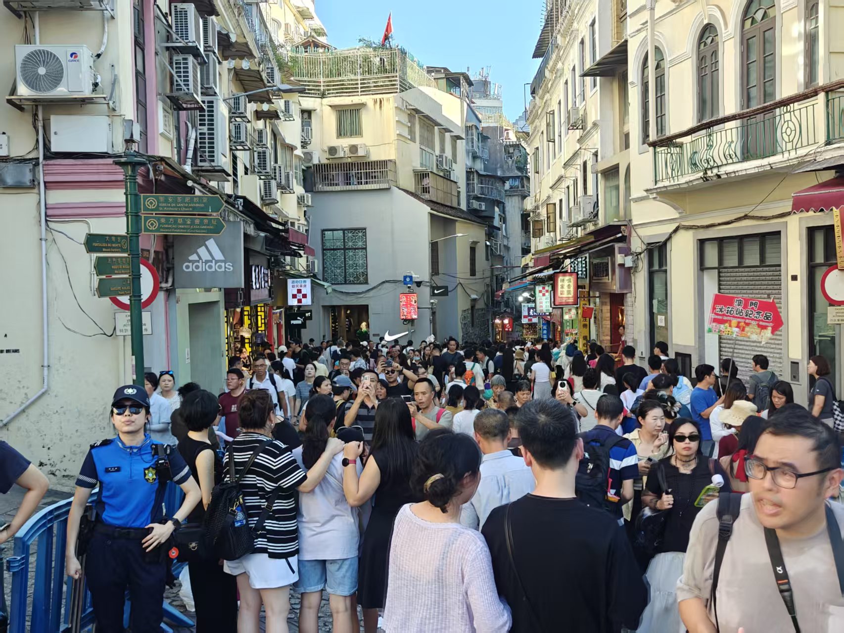 今日下午,大三巴牌坊前的廣場及周邊街巷被來自各地的遊客填滿,人頭攢動,摩肩接踵。無論是標誌性的大三巴牌坊前的階梯,還是周邊的手信街、戀愛巷,處處都是遊客駐足拍照、逛店消費的身影;不少店舖派員到門前吆喝買賣,以「試吃」攬客,店員們忙得不亦樂乎。面對洶湧的人流,當局一度於下午2時40分實施人潮管制,行人只可沿大三巴街單向上行前往牌坊,並取道周邊街巷如大關斜巷、關前後街、高園街等離開。相關措施實施至下午4時25分取消。