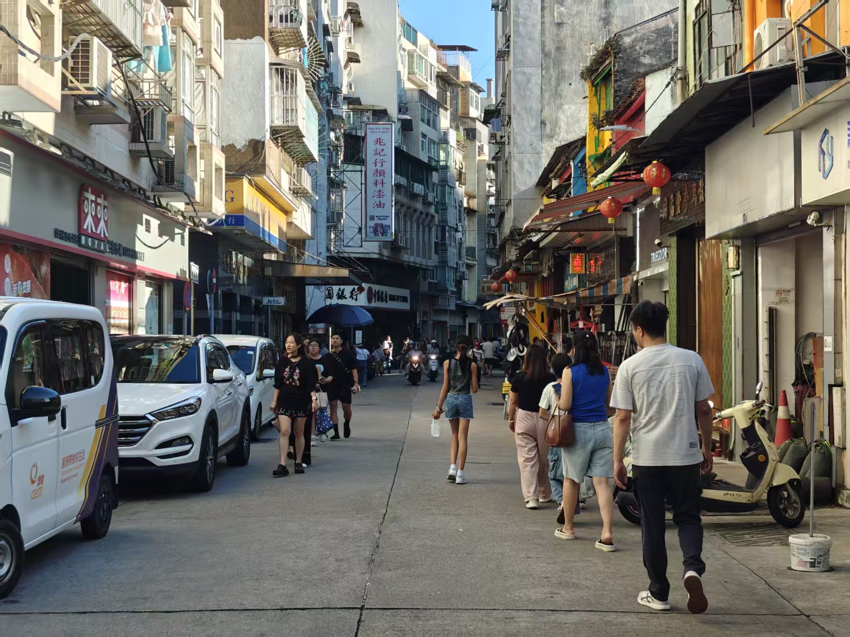 而與大三巴的熱鬧形成鮮明對比的是其隔壁的舊區十月初五日街,這裏行人稀疏,街道上車流與行人混雜,不時出現人車爭道的情況,既影響了行人的出行安全,也讓本就冷清的街道更顯雜亂,在一定程度上也阻礙了潛在消費者的到訪意願。區內有商家表示,由於關前後街國慶期間設置了臨時行人專用區期間,由營地大街來車,只能取道草堆街沿十月初五日街前往康公廟及沙欄仔一帶,導致這邊交通擁擠,出現遊客與車輛爭道的情況,他期望相關部門能在假期增派人手疏導交通,規範車輛行駛與停放,為行人營造安全、順暢的購物環境,以此吸引更多遊客走進來,助力老區煥發商業生機,讓這片承載著澳門歷史記憶的舊街區也能共用國慶假期的消費紅利。
