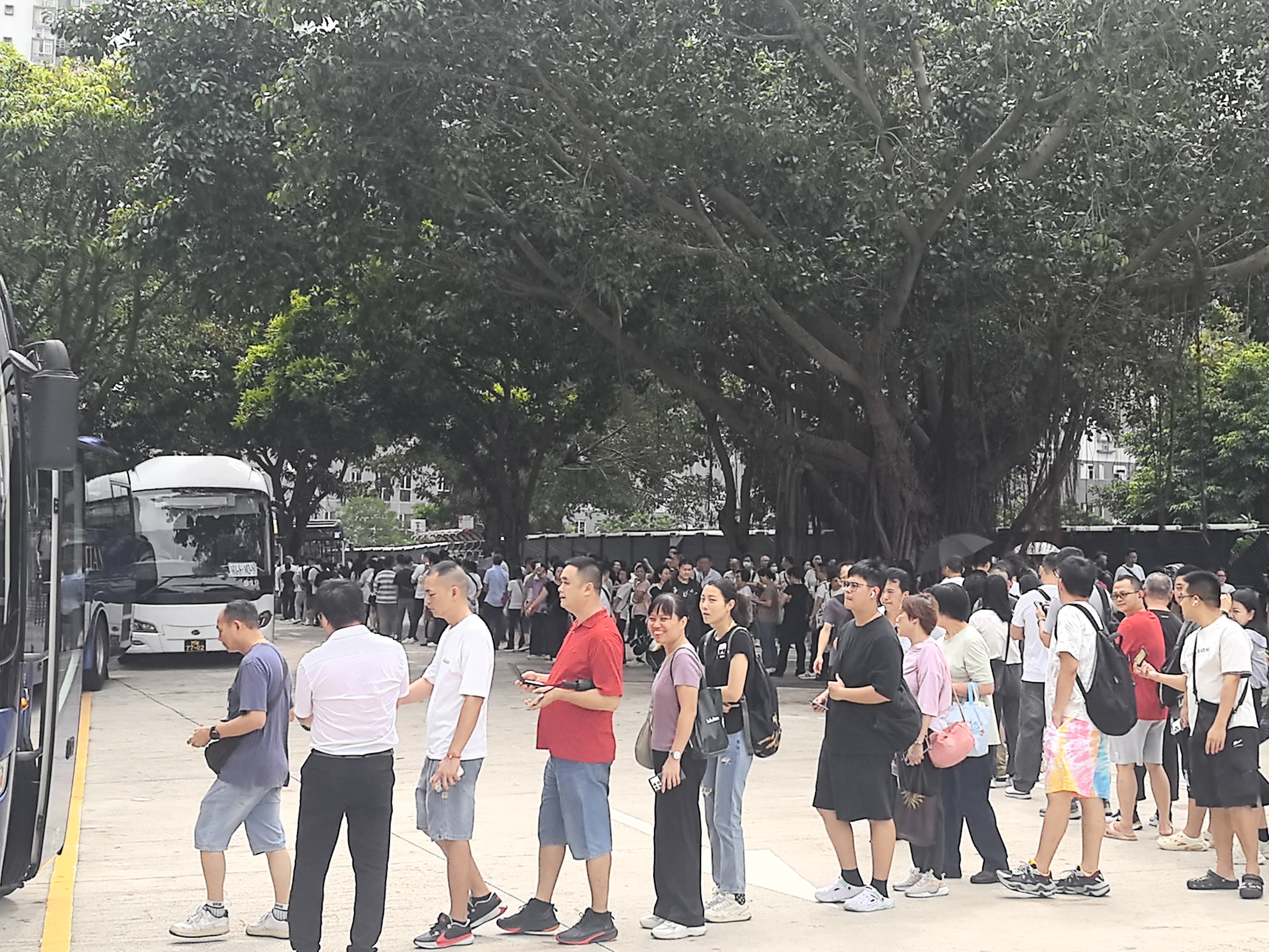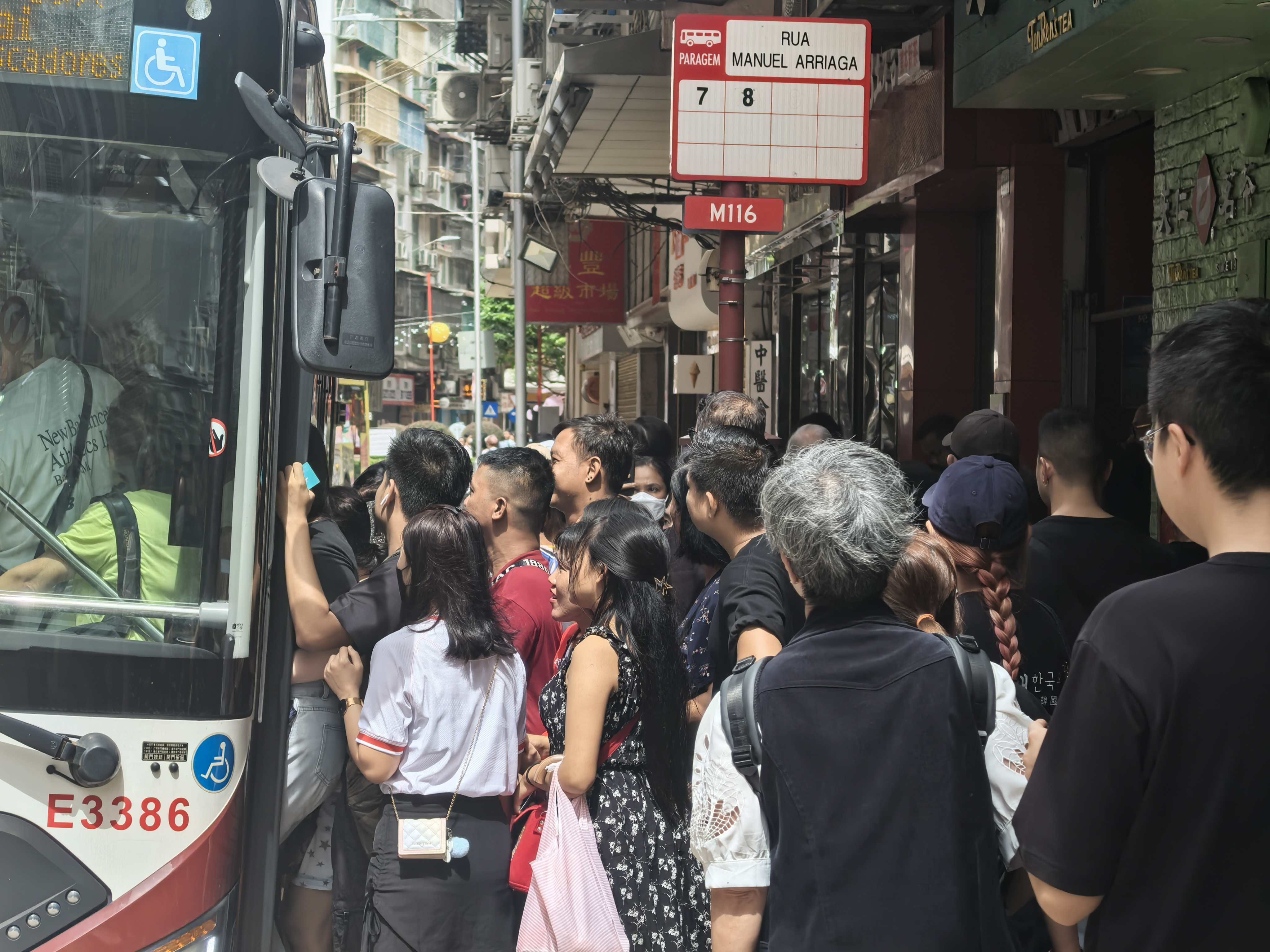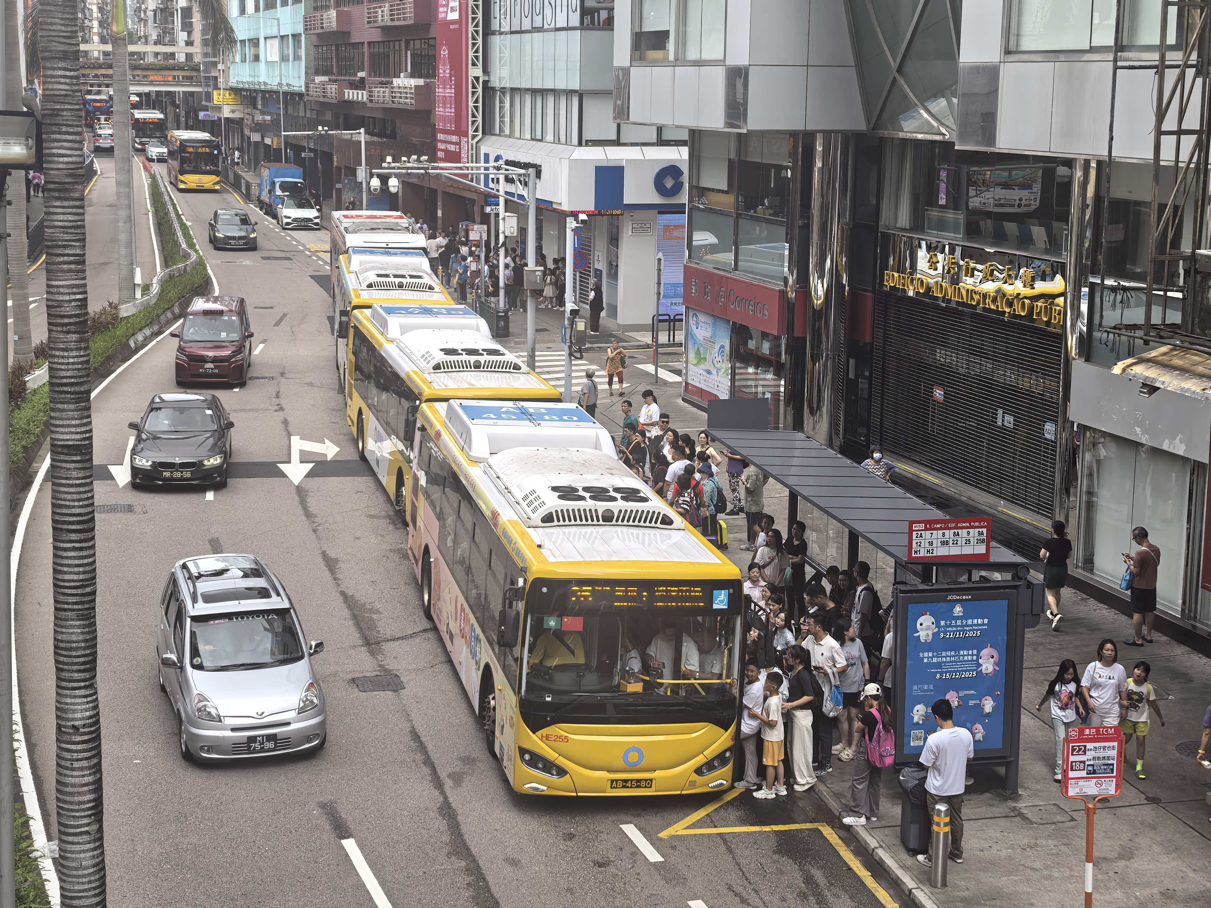 本澳市面下午開始交通大致回復正常,不少市民及遊客在巴士站等候乘搭巴士,青茂口岸附近亦有大批人士排隊輪流乘搭車輛上班。